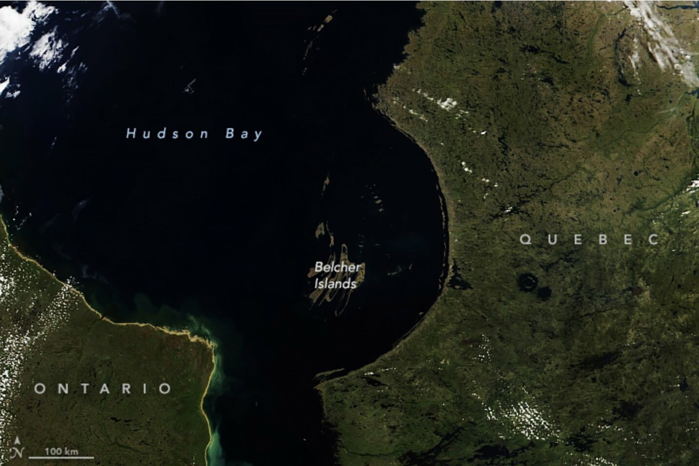 The southeastern shore of the Hudson Bay forms a near perfectly curved shoreline.