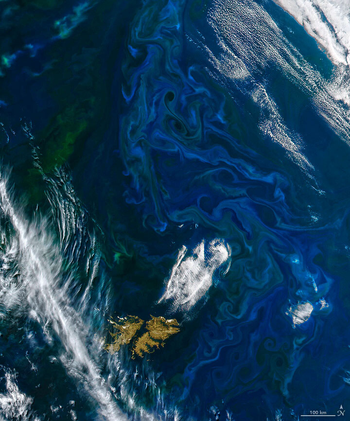 The color of the swirls tells scientists about the plankton in the bloom and nutrient cycling in the ocean.