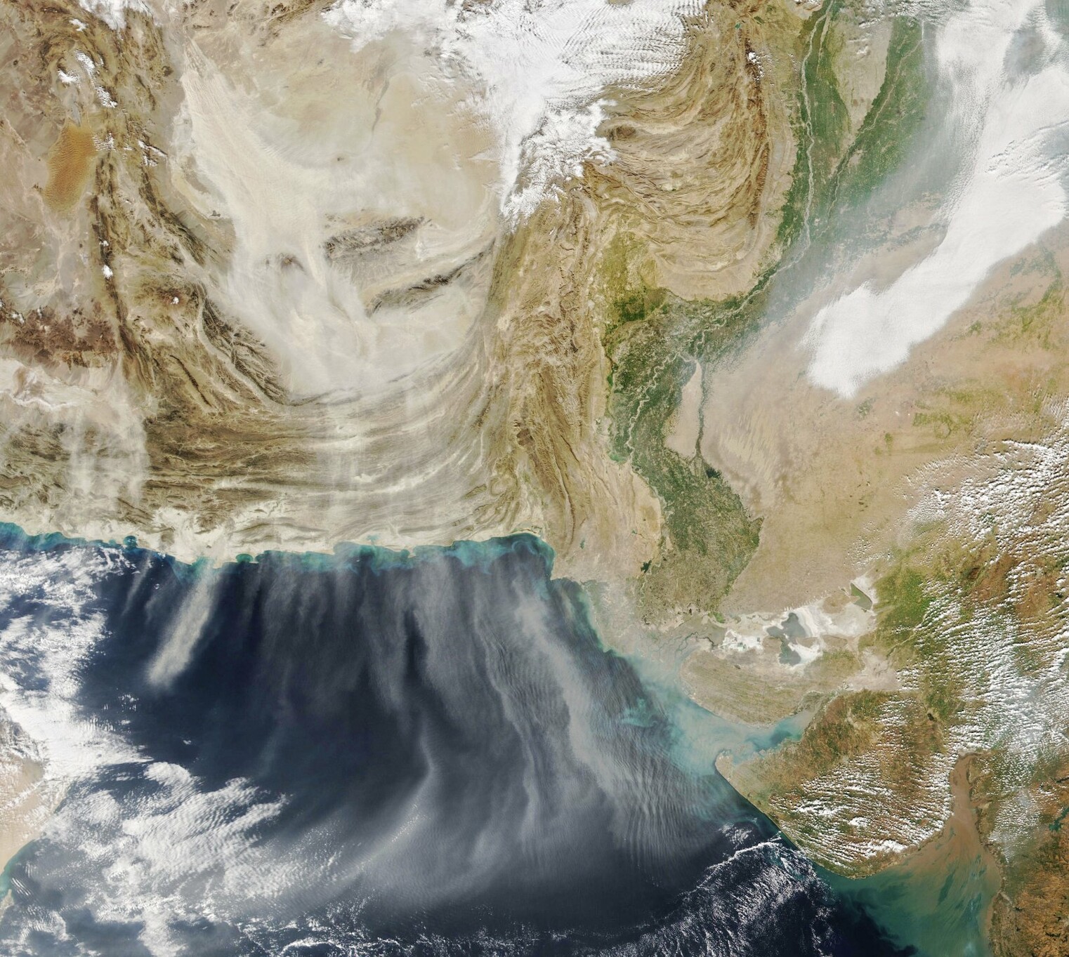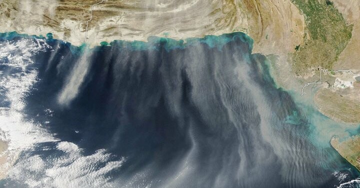 The series of maps below show dust spreading toward the south over Pakistan, India, and the Arabian Sea during six-hour intervals on January 12.
