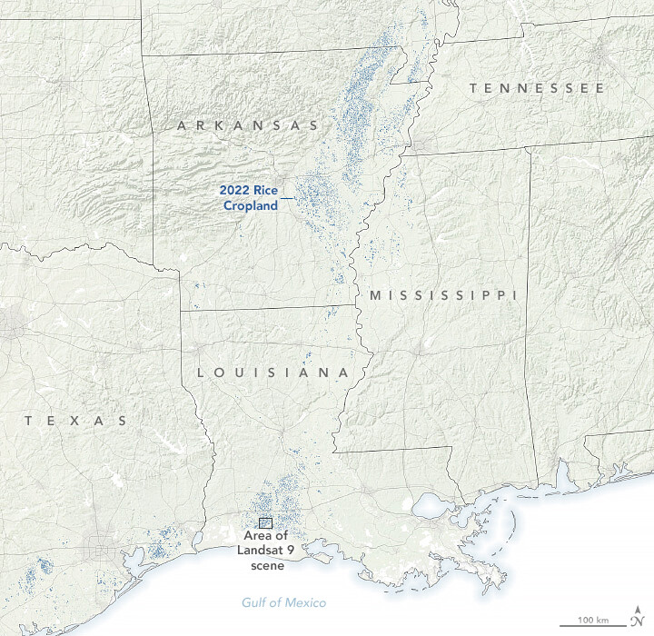 In 2021, the Rice Belt (Arkansas, Louisiana, Mississippi, and Texas) produced about 73%of all rice in the U.S. The map here shows rice-growing areas within these states (in blue) in 2022.