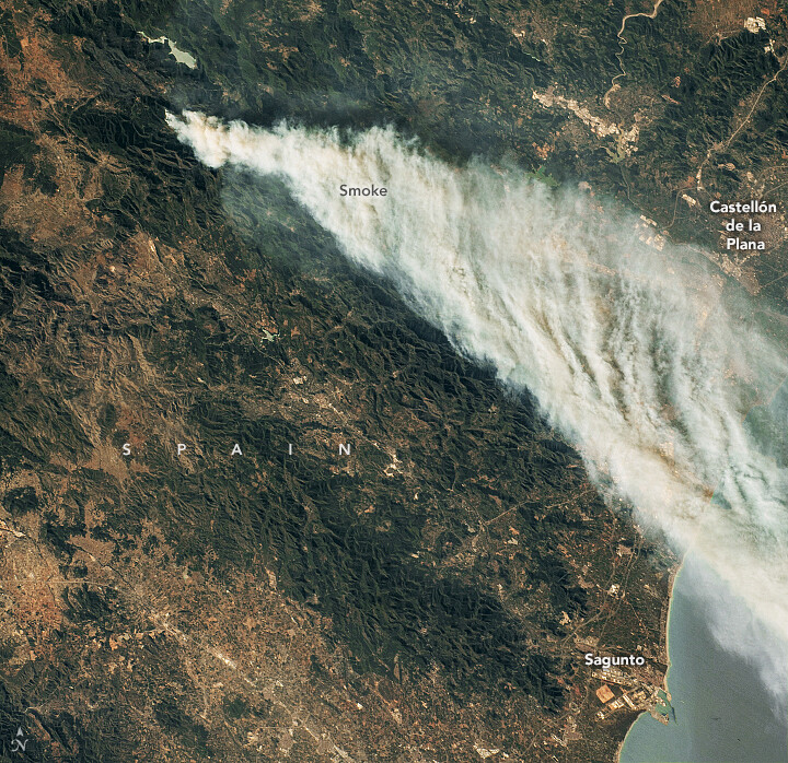 Spain’s fire season got off to an early start with an intense blaze in the eastern Castellon province. An astronaut on the @Space_Station took this photo on March 27, as a thick plume of smoke streamed southeast toward the Mediterranean Sea.