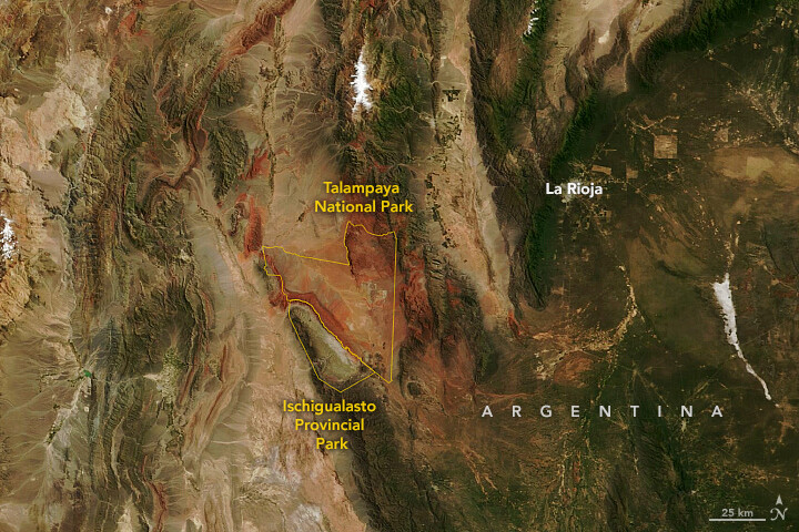 This @nasa Terra satellite image shows the Ischigualasto and Talampaya parks in northern Argentina, an area that was teeming with crocodile- and mammal-like reptiles in the Triassic 252-200 million years ago. go.nasa.gov/40LPrnD