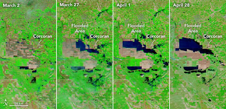NASA’s Aqua satellite captured the progression of flooding in the Tulare Lake basin from March 2 to April 28.