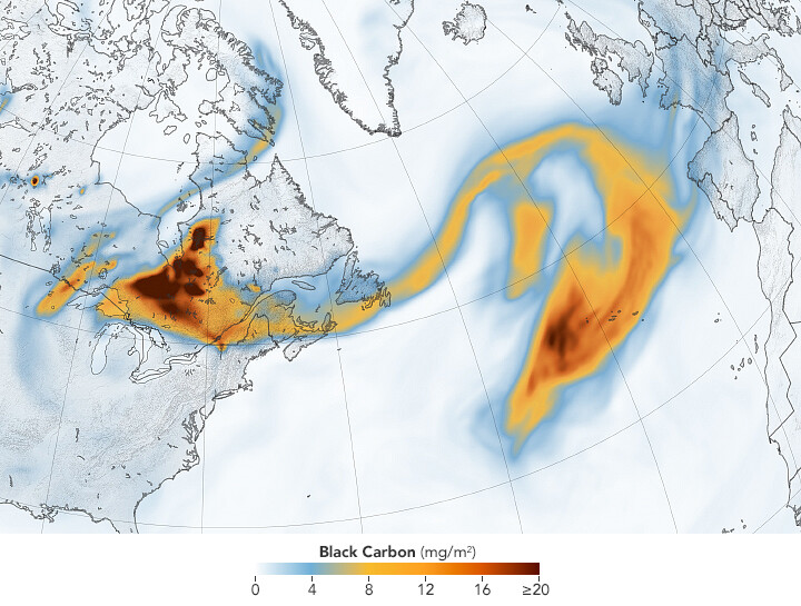 This map shows the density of black carbon particles – or soot – from North America across over 2,000 miles of the Atlantic Ocean.