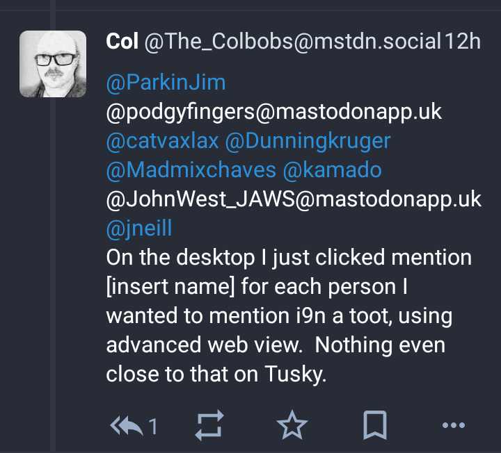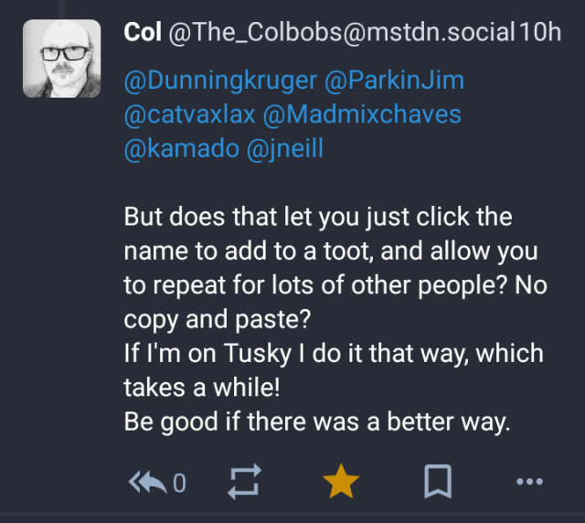 I just realised by clicking on the three dots in your profiles and clicking mention, I can add all you great folks in to one toot, just so I can say