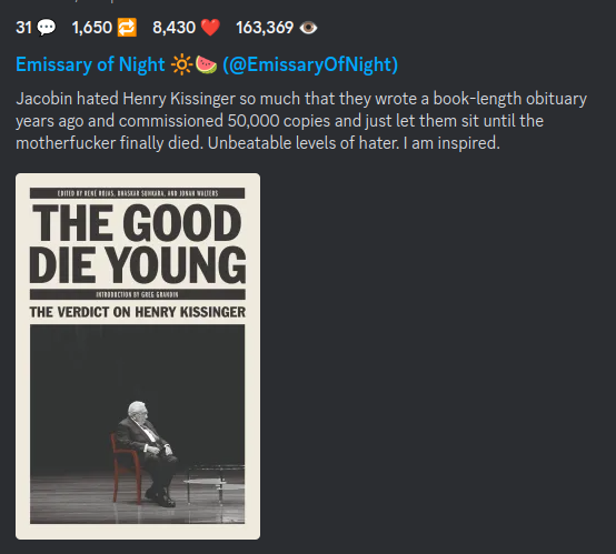 "Jacobin hated Henry Kissinger so much that they wrote a book-length obituary years ago and commissioned 50,000 copies and just let them sit until the motherfucker finally died. Unbeatable levels of hater. I am inspired."