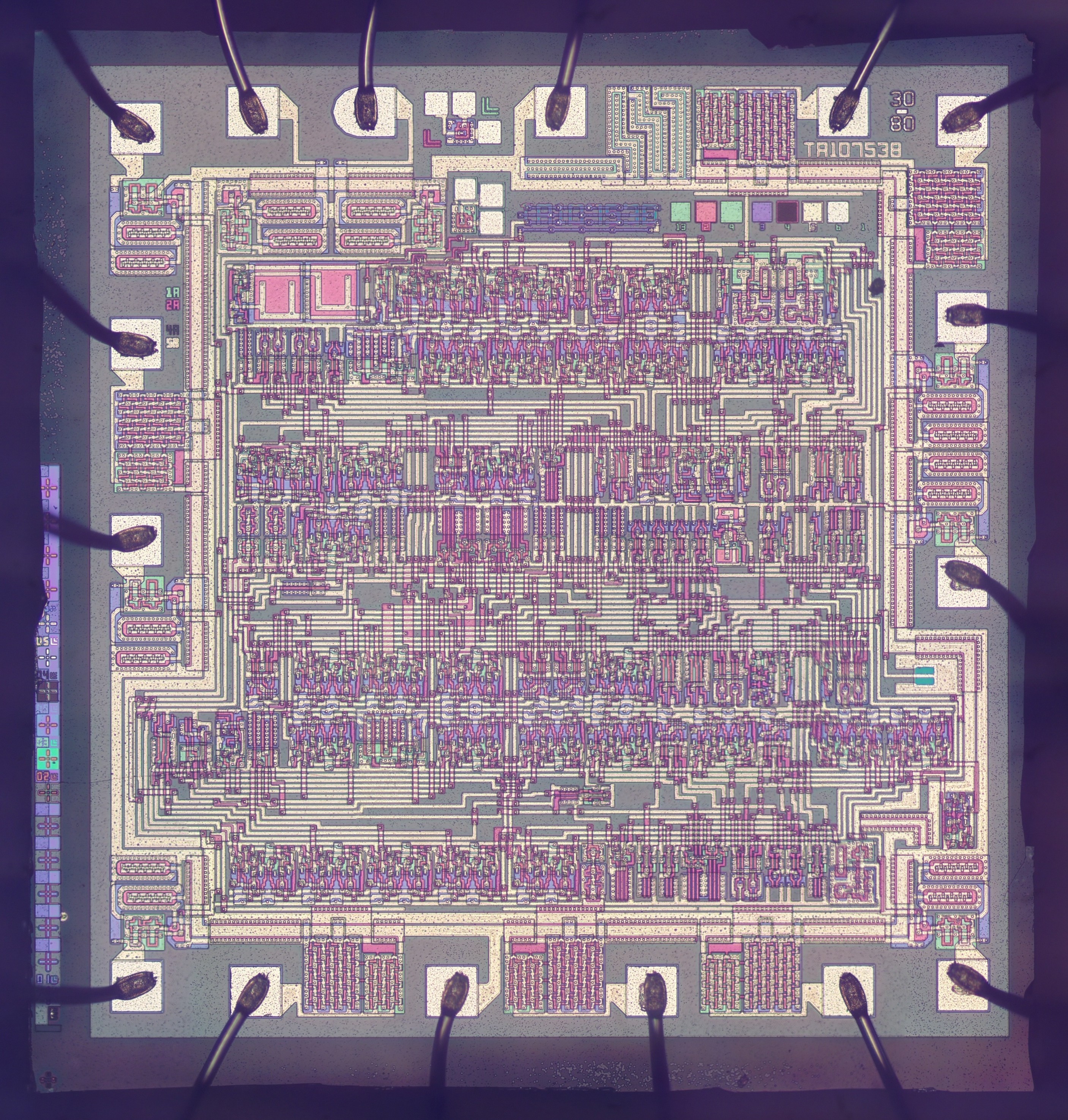 Most chips are formed on a silicon wafer, but this RCA telecommunications chip is constructed from sapphire. It is a silicon-on-sapphire CMOS chip, with silicon circuits sitting on top of a thin sapphire substrate. 1/11