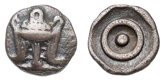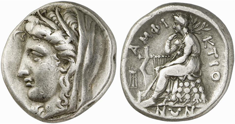 "Head of Demeter to left, wearing wreath of wheat ears and veil ΑΜΦΙ-ΚΤΙΟ-ΝΩΝ, Apollo Pythios, laureate and wearing a chiton, seated left on an omphalos draped with his himation and covered with a network of knotted woolen cords. His right elbow is propped on his kithara, he rests his chin on his right hand and he holds a long laurel branch over his shoulder with his left hand... In the field to left, tripod."