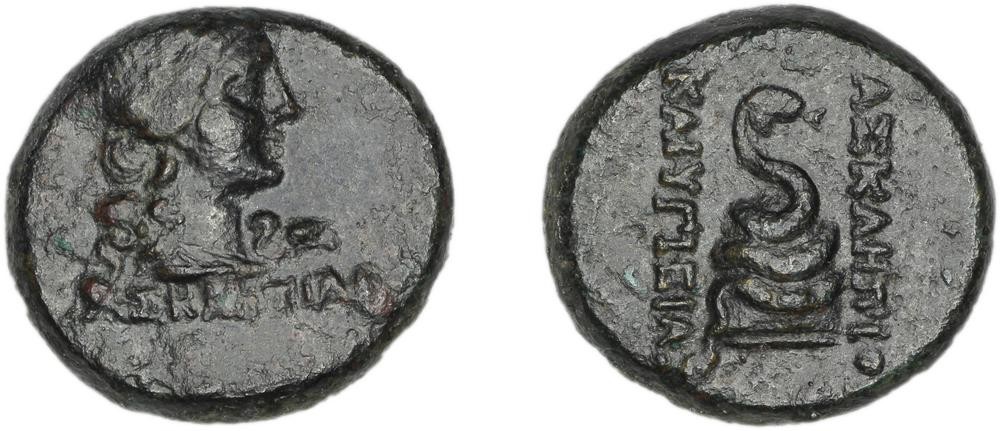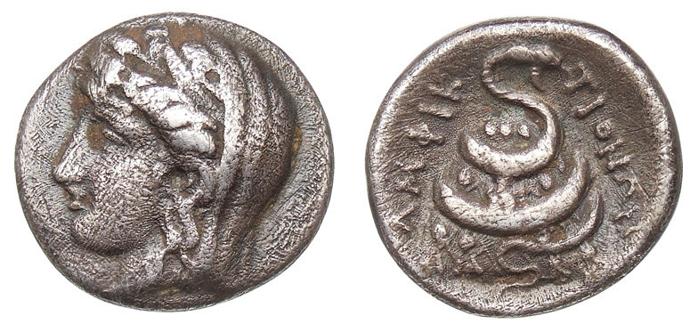 Head of Hygieia, right; to right, snake. (obverse) Snake coiled around omphalos, right. (reverse).