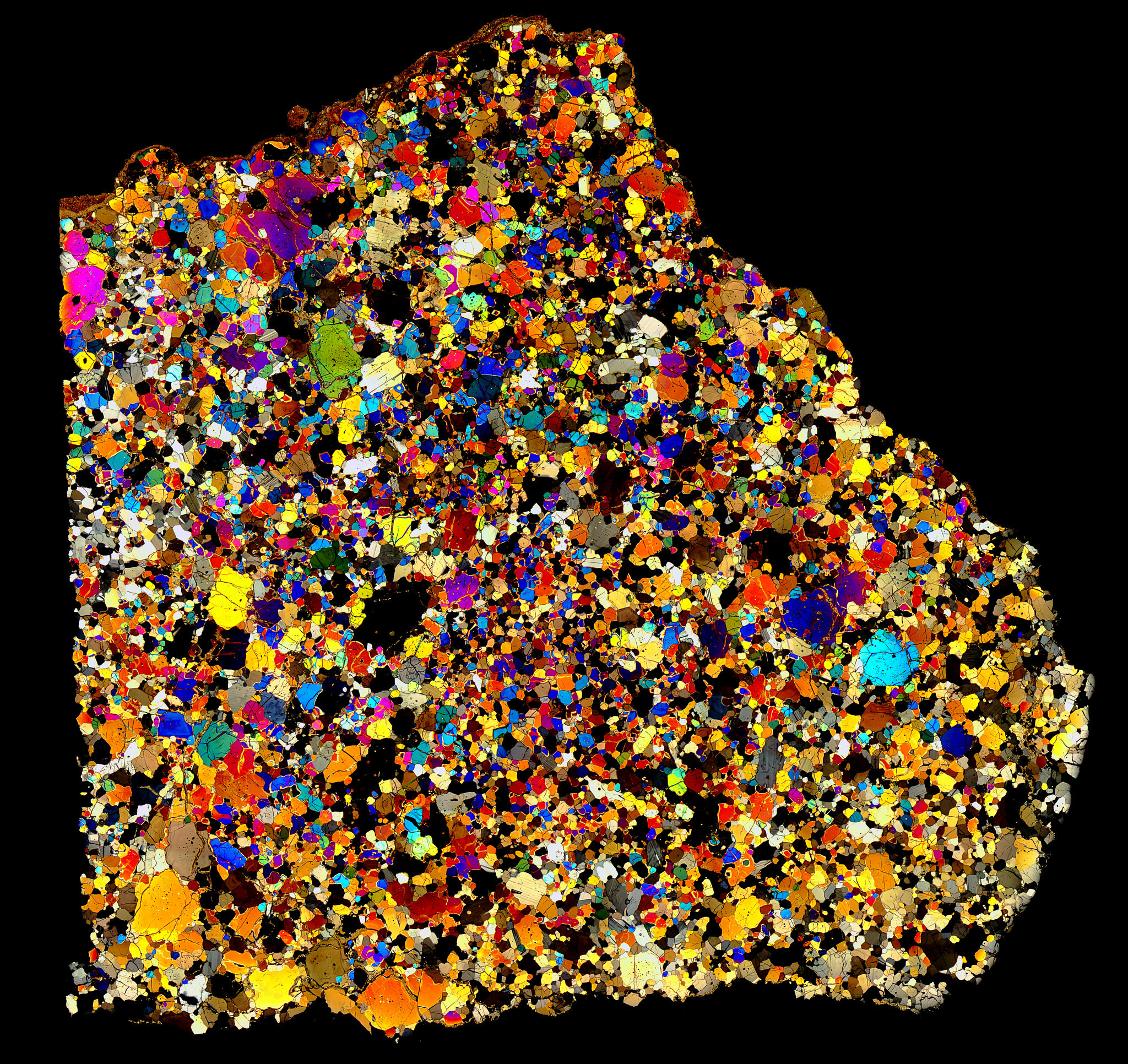 Another of the more colorful examples in XPL, Northwest Africa (NWA) 4801 Meteorite Thin Section - Angrite.