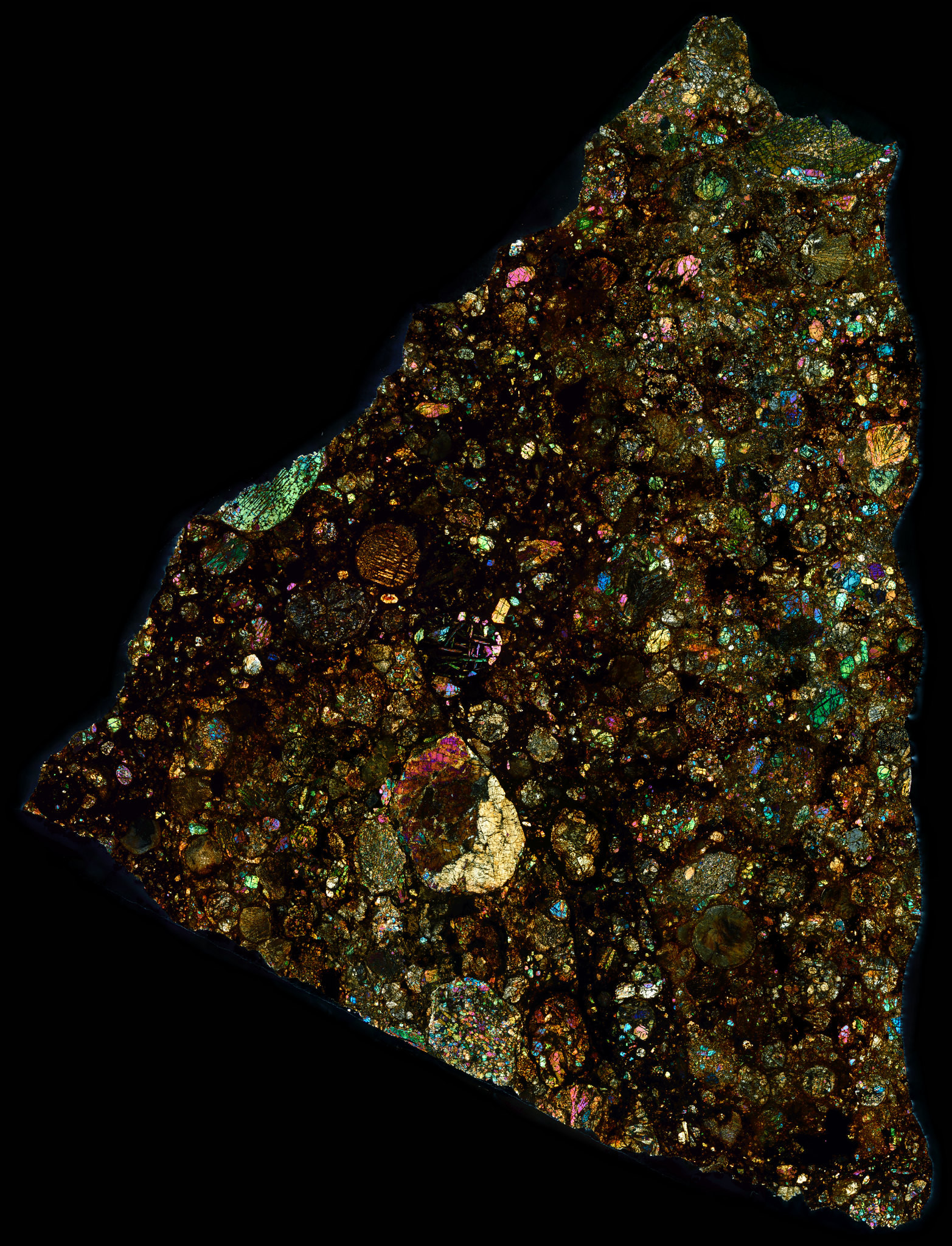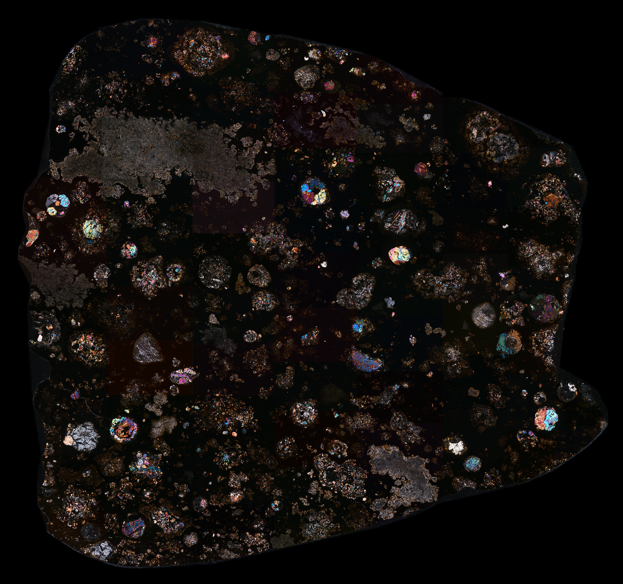 Thin Section of the Northwest Africa (NWA) 10214 Meteorite in Cross Polarized Light.
