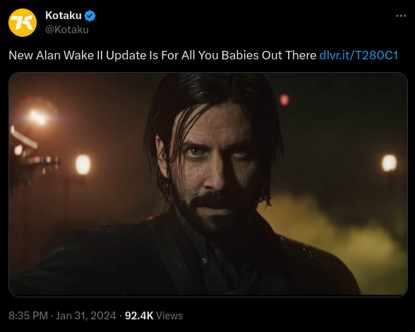Article title: "New Alan Wake II Update Is For All You Babies Out There"