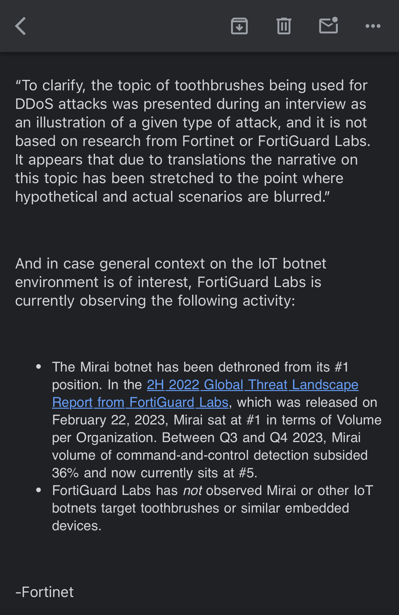 Fortigate have issued me a statement. The toothbrush DDoS story is completely made up.