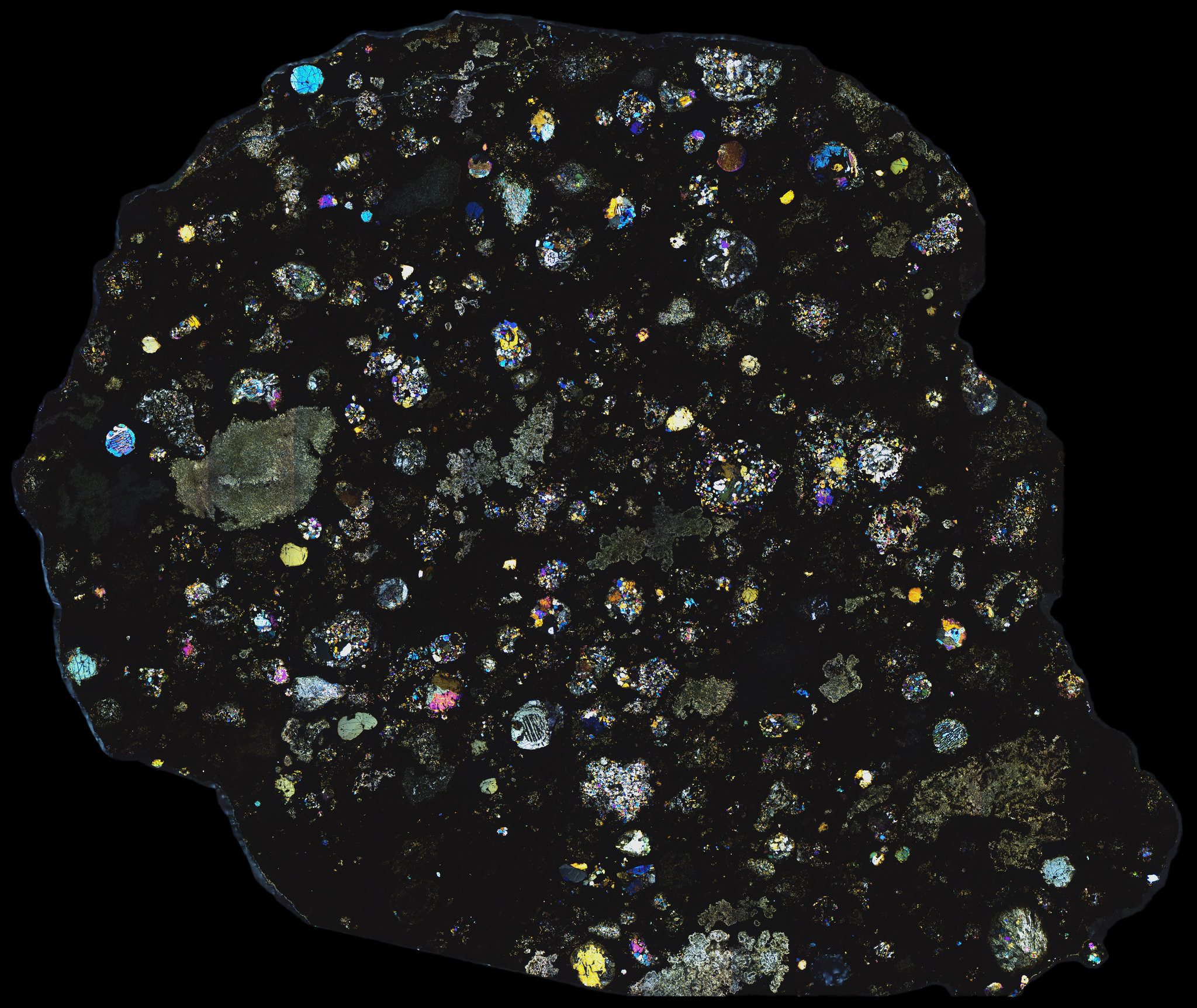Thin section of NWA 2364 in cross polarized light. This meteorite has inclusions with age 4.5682 billion years.