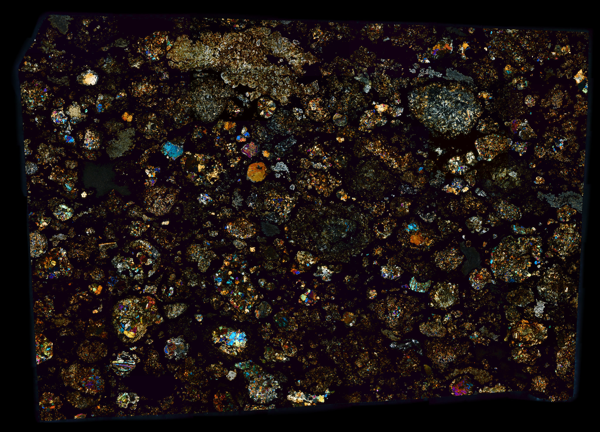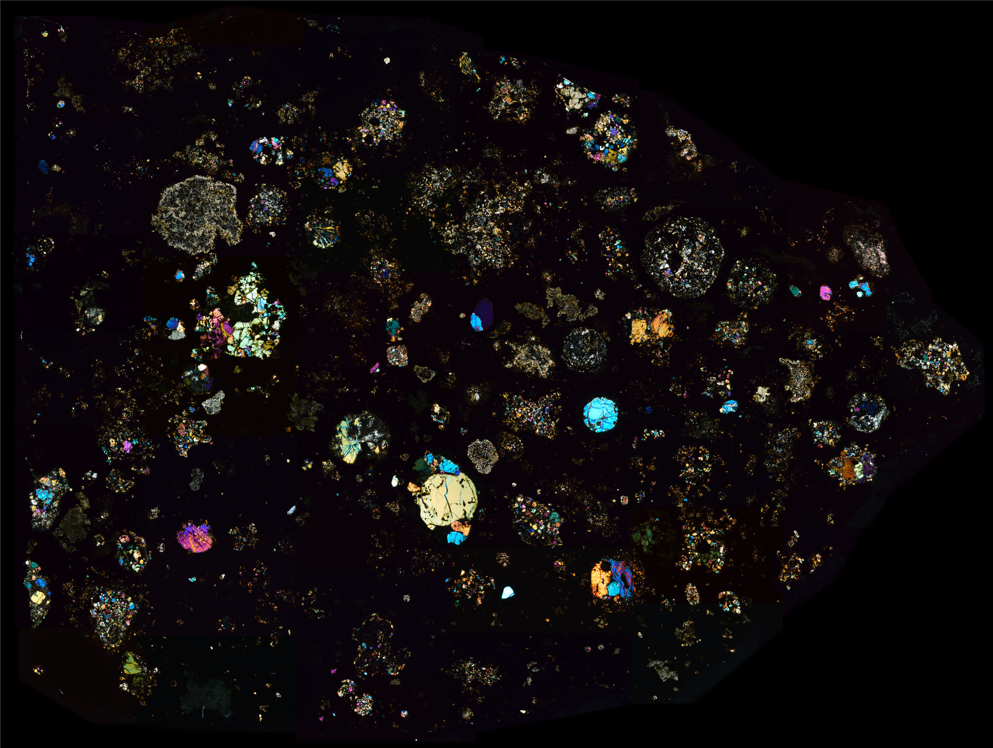 Thin Section of the Allende Meteorite in Cross Polarized Light.