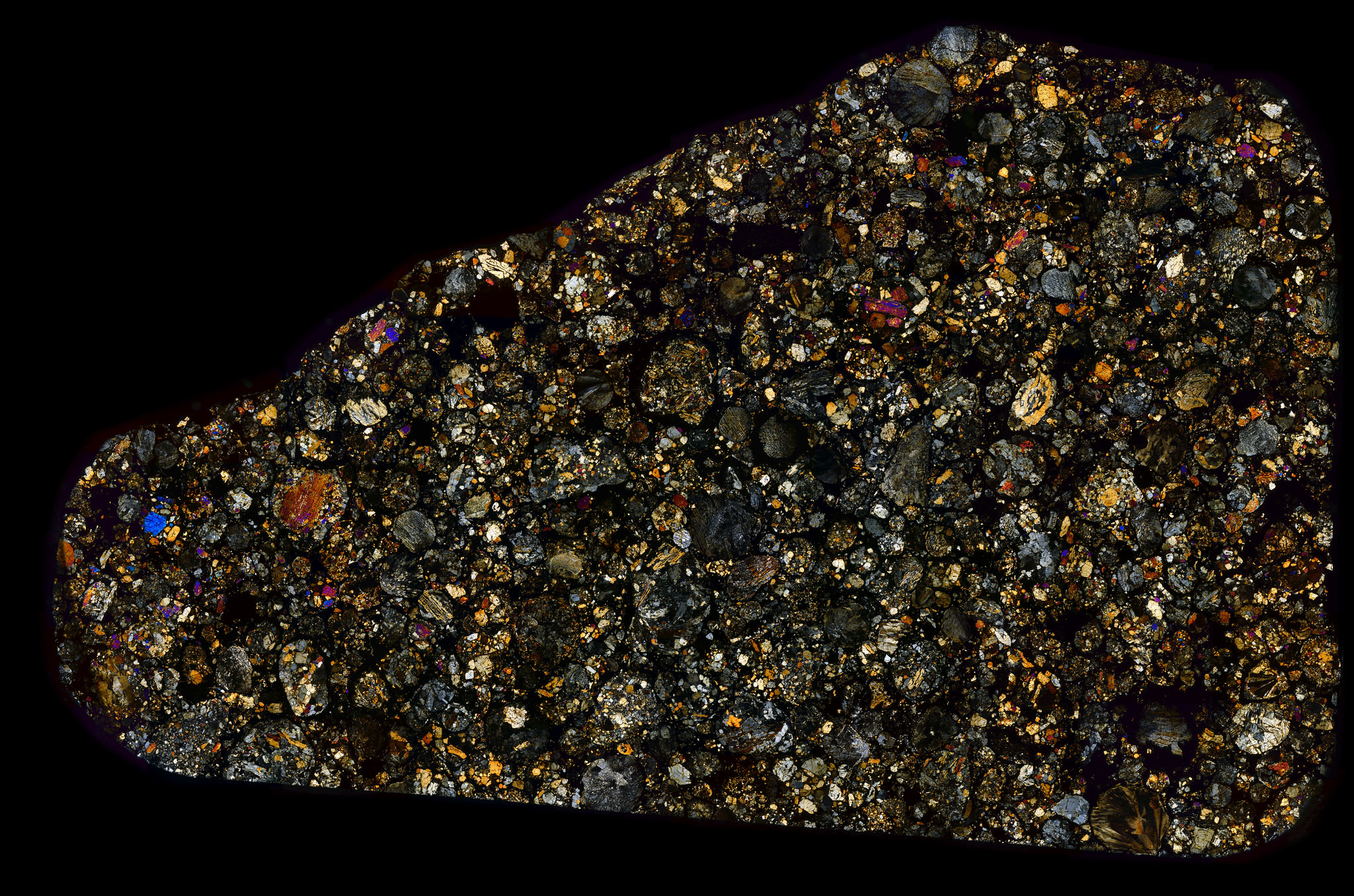 Thin Section of the Kainsaz Meteorite in Cross Polarized Light.