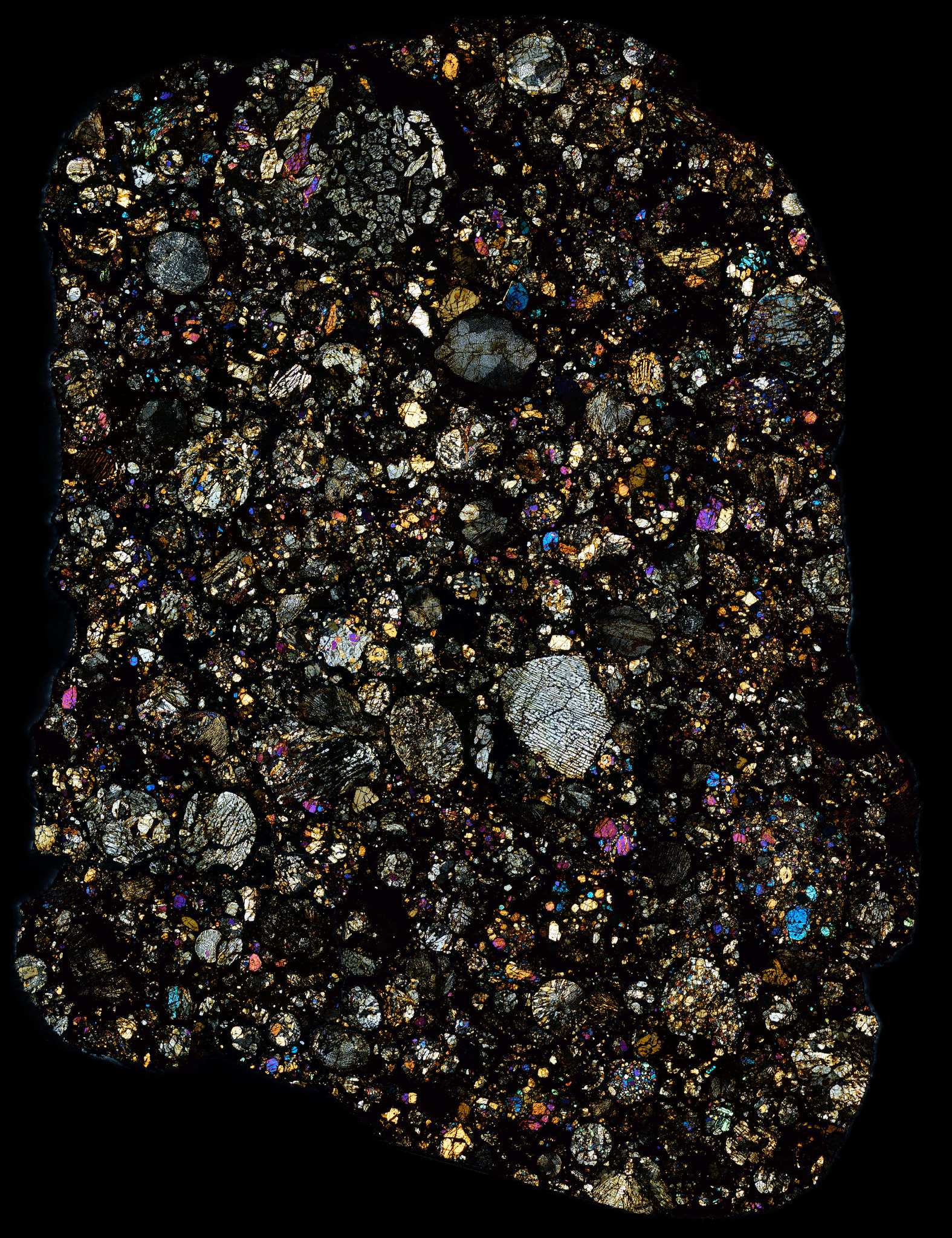 Thin Section of the Northwest Africa (NWA) 2737 Meteorite in cross polarized light.