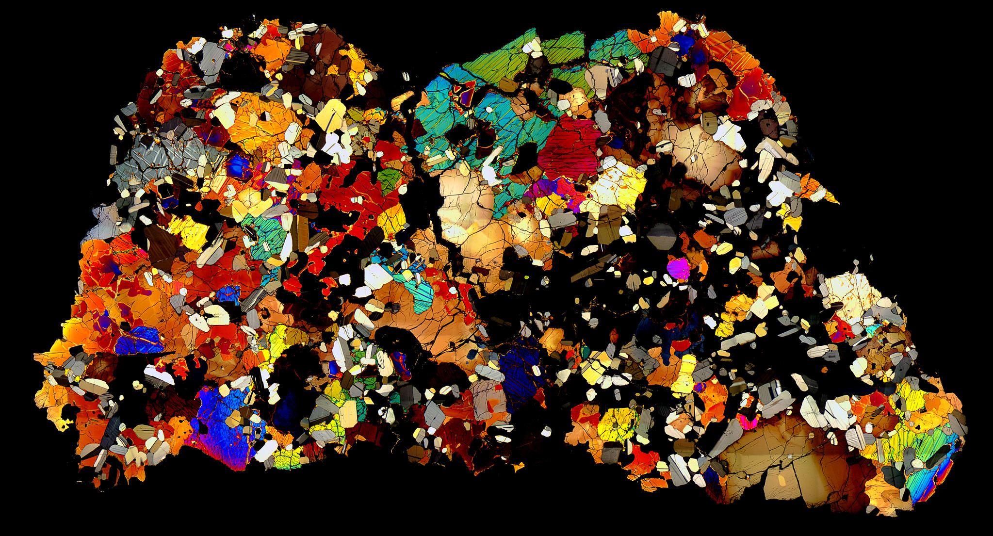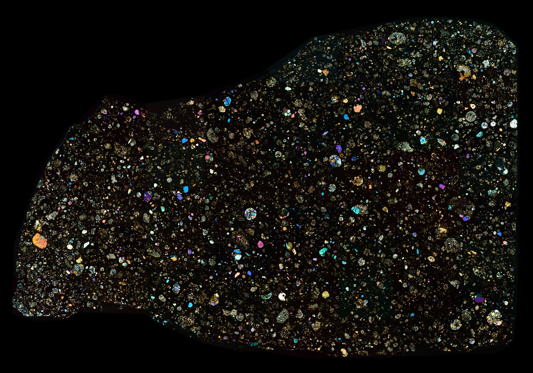 Thin Section of the Northwest Africa (NWA) 4590 Meteorite in cross polarized light.