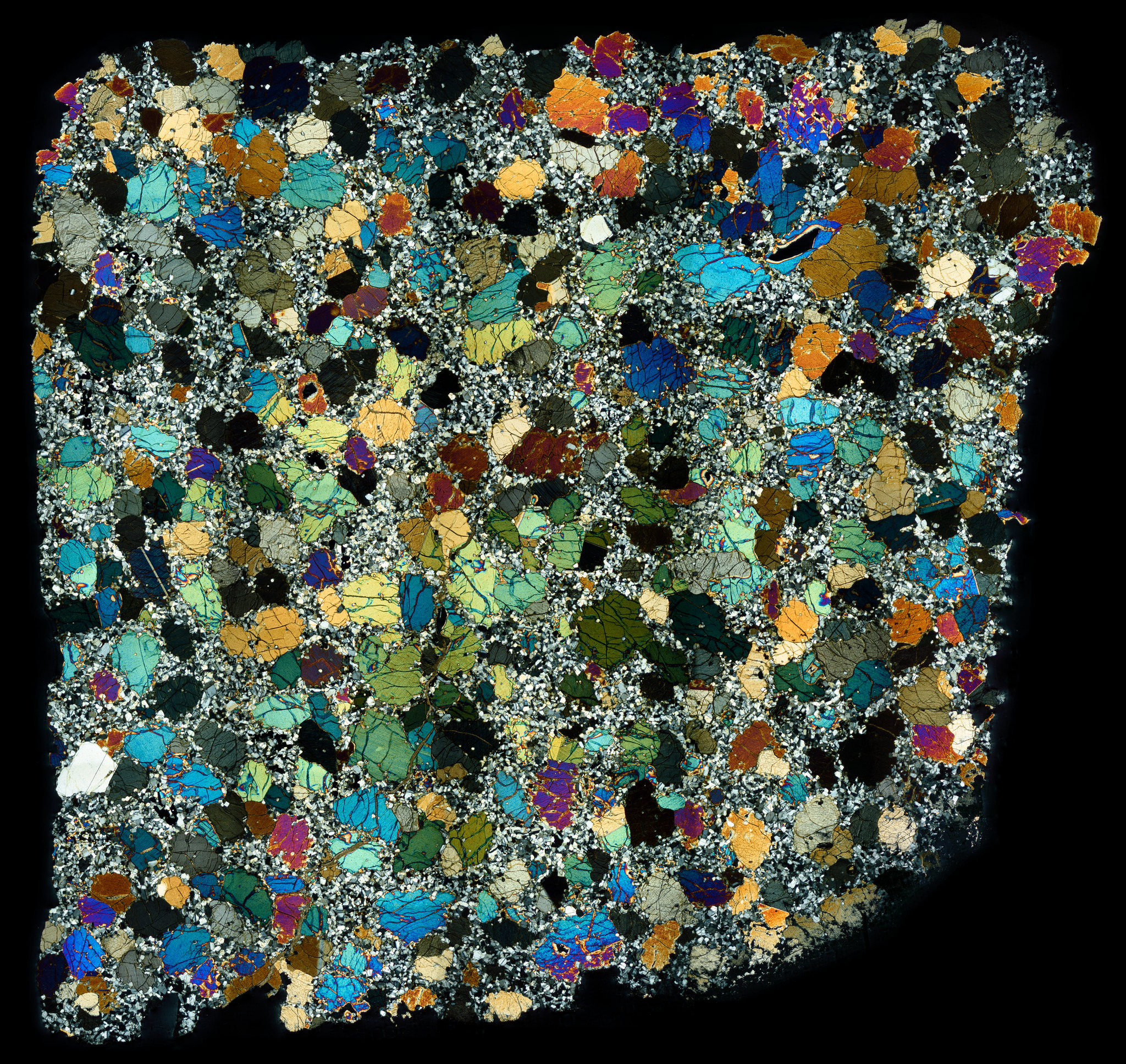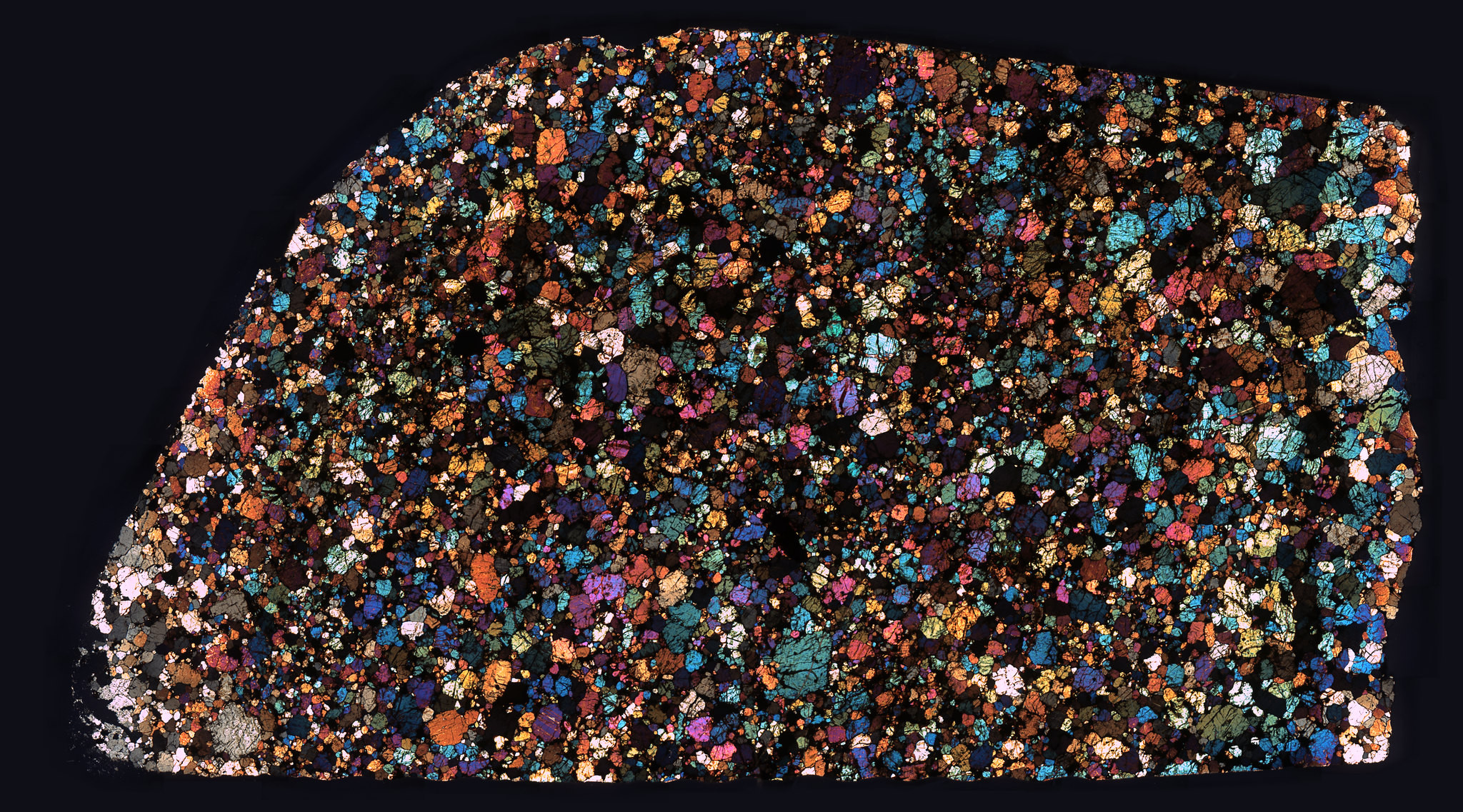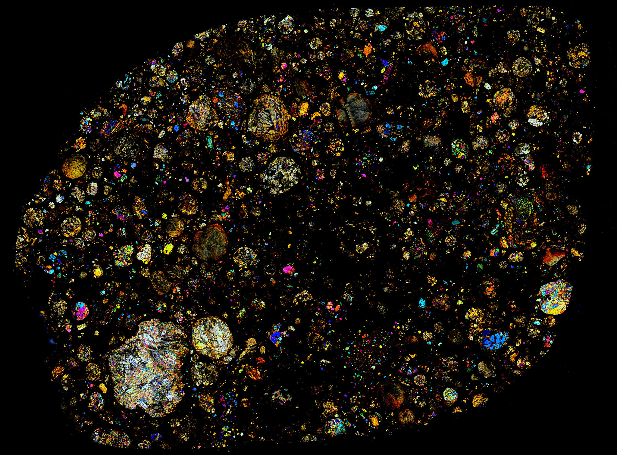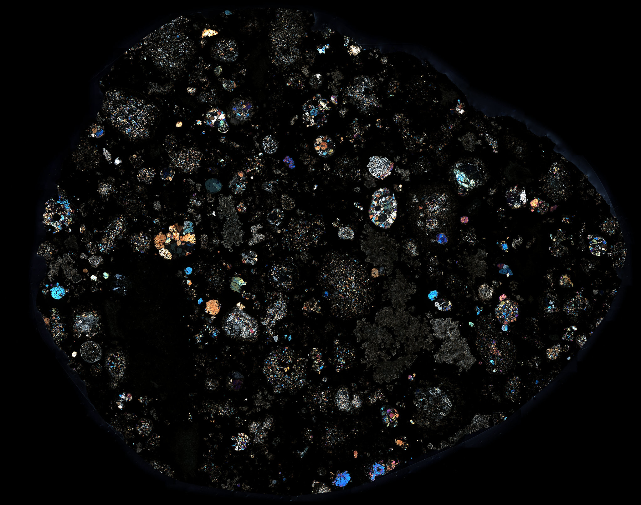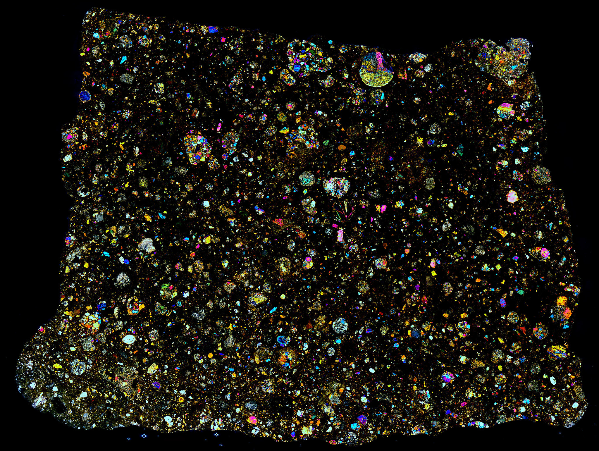 Thin Section of the Allende Meteorite in Cross Polarized Light.
