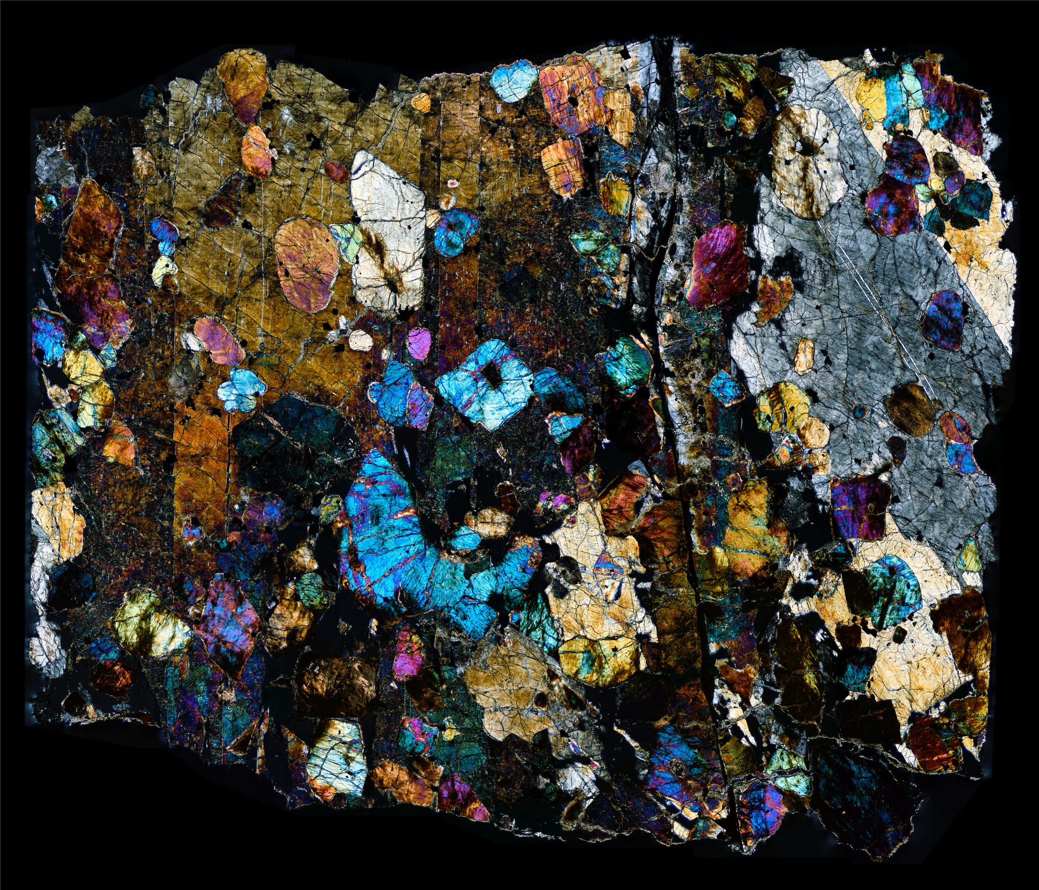 Thin Section of the Northwest Africa (NWA) 1950 Meteorite in cross polarized light.