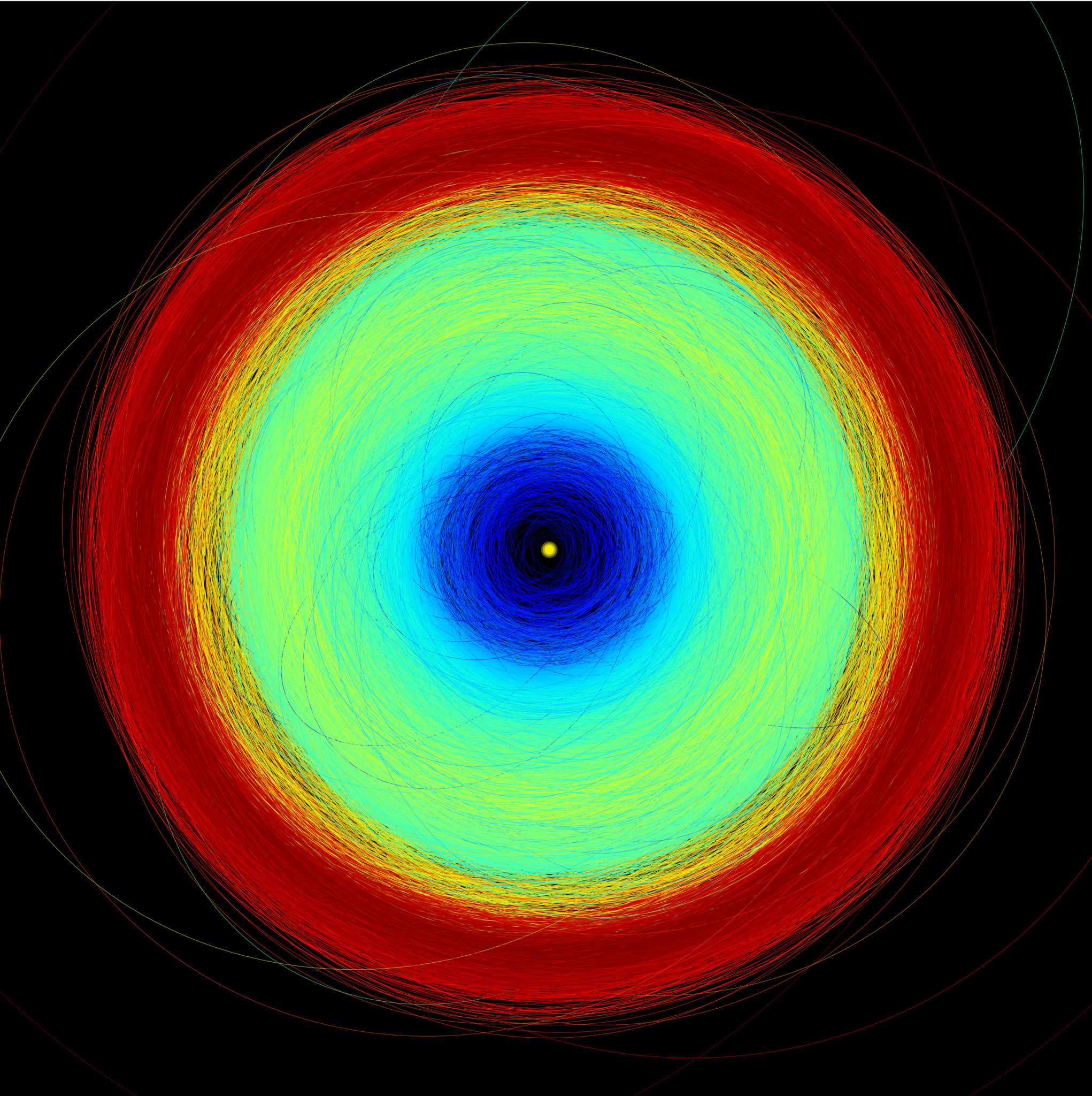 "...150000 asteroids in Gaia’s data release 3, from the inner parts of the Solar System to the Trojan asteroids at the distance of Jupiter, with different colour codes. The yellow circle at the centre represents the Sun. Blue represents the inner part of the Solar System, where the Near Earth Asteroids, Mars crossers, and terrestrial planets are. The Main Belt, between Mars and Jupter, is green. Jupiter trojans are red"