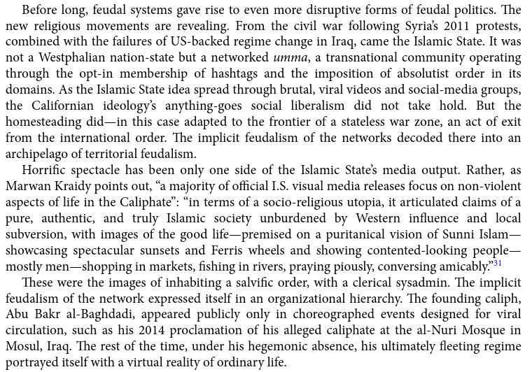 With ISIS back in the (US) news, I have been thinking back to this passage in chapter two of Governable Spaces on ISIS as an apotheosis of "implicit feudalism," a networked polity "with a clerical sysadmin."