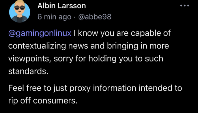 in reply to Liam @ GamingOnLinux ๐ง๐ฎ • • •I respect you and your work, but I heavily recommend that you pay these people no mind.