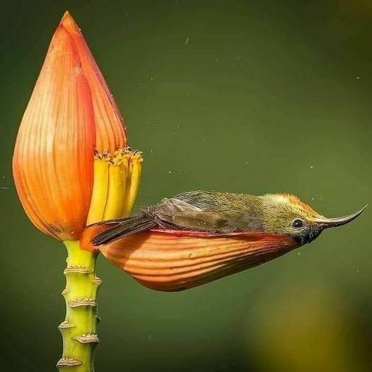 Tiny spiderhunter sunbird has spa day in a banana flower leaf. - Funny Animal Memes and GIFs that are pure comedy gold.Motide (Animal Comedy)