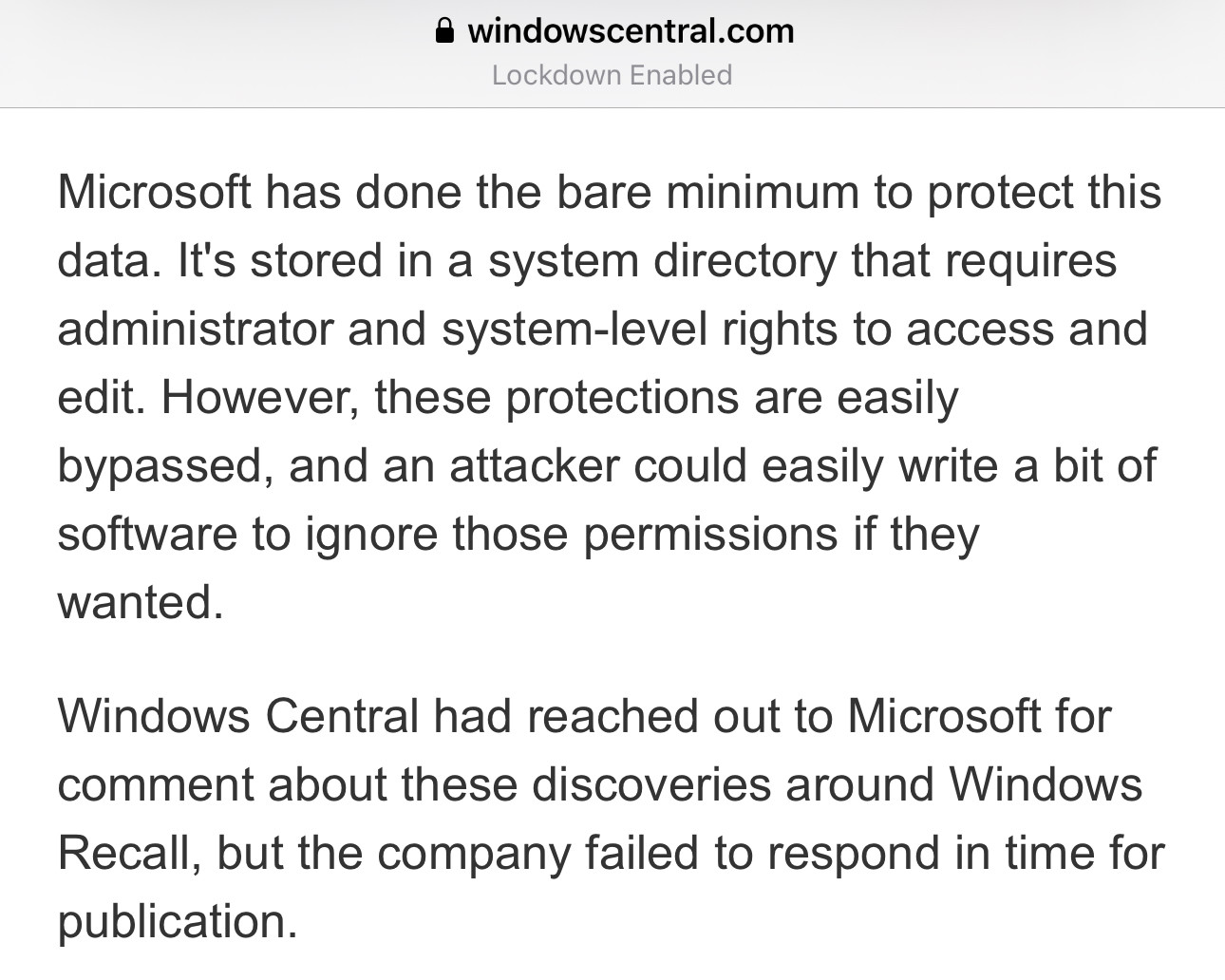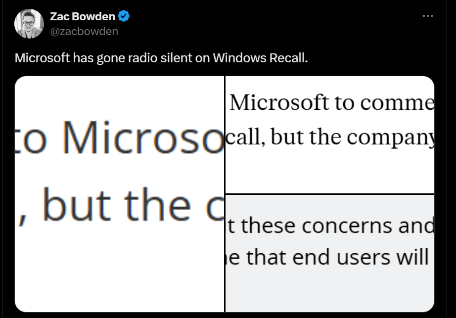 in reply to Kevin Beaumont • • •If anybody is wondering what Microsoft's reaction to any of the Copilot+ Recall concerns are, they're continuing to decline comment to every media outlet.