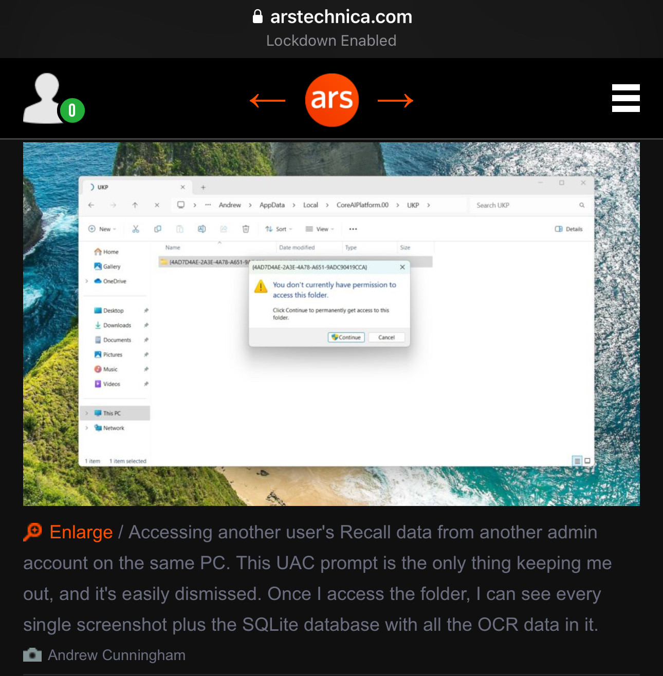 ArsTechnica enabled Recall on Windows 11 box and tested the claim. By logging in as another user they could access the database and screenshots.