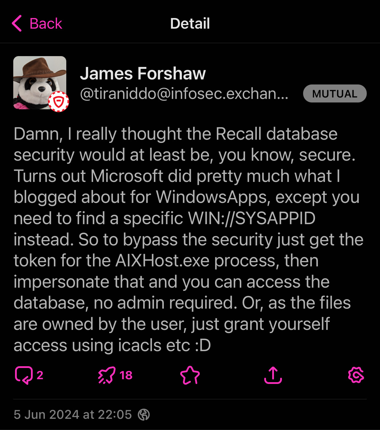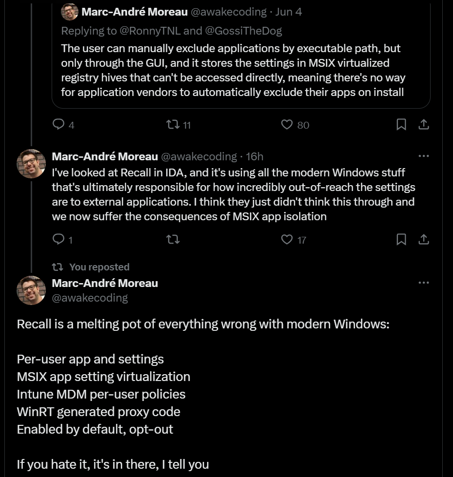 in reply to Kevin Beaumont • • •I hadn’t been aware until today of the external reaction to Recall. Holy shit. Tim Apple must be pleased.