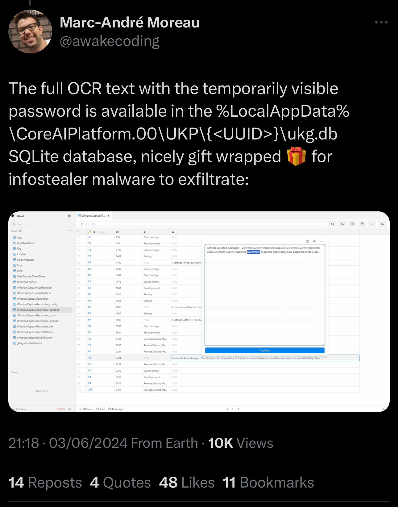 in reply to Kevin Beaumont • • •Some screenshots of Recall's SQLite database here: mastodon.social/@detective/112…
