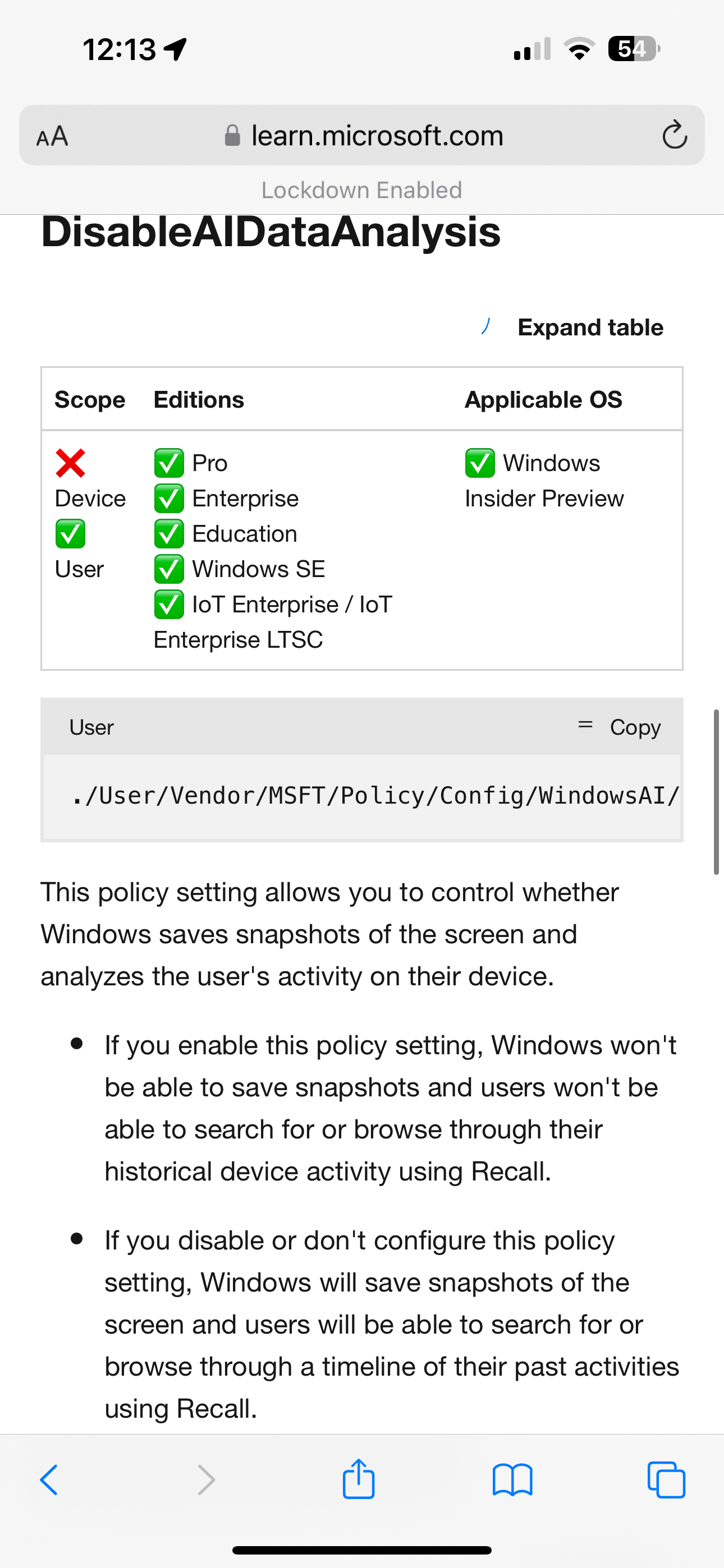 in reply to Kevin Beaumont • • •If anybody is wondering if you can enable Recall on a machine remotely without Copilot+ hardware support - yep.