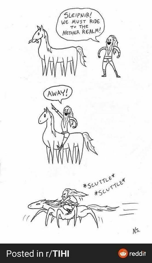 ‘So the Aesir commissioned a giant to build a wall. If he delivered the pizza in over 30 minutes it would be free, but if he did it on time he would get the sun, the moon, and Freya. He was initially on schedule due to the aid of his horse. Loki turned into a female horse to distract it. The pizza was free, and Loki gave birth to an 8-legged horse’