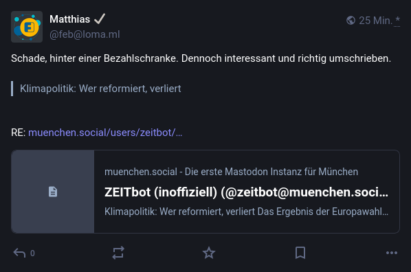 Ich habe das Problem, dass Beiträge bei denen offensichtlich ein Link enthalten ist nicht die Vorschau angezeigt wird. Beispielsweise bei diesem Beitrag von @Matthias ✔. Dieser Beitrag (loma.ml/display/373ebf56-5166-67f8-2266-9d6568309141) von ihm wird bei mir so in der Timeline dargestellt: