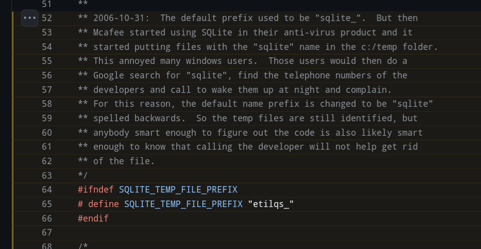 tldr; mcaffee made a shit ton of sqlite files in the temp folder causing people to call the sqlite devs phone angrily. now they name all files etilqs to prevent this.