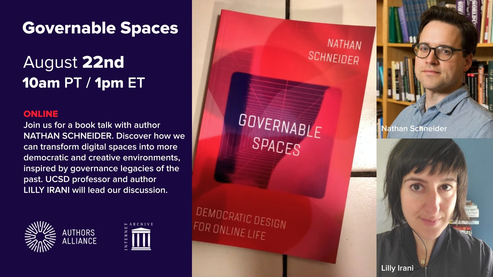 Join us for a book talk about GOVERNABLE SPACES with author NATHAN SCHNEIDER. Discover how we can transform digital spaces into more democratic and creative...Internet Archive