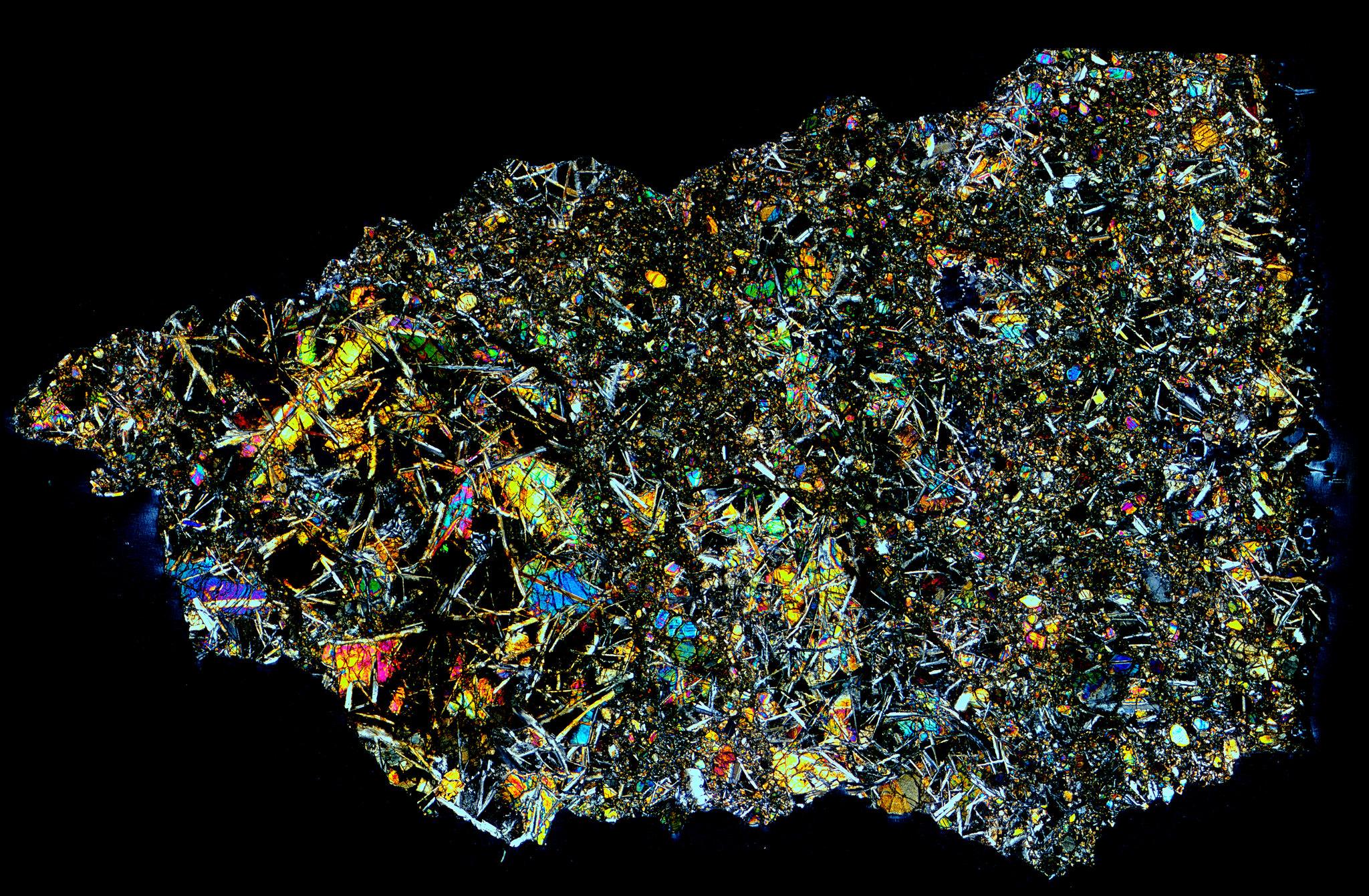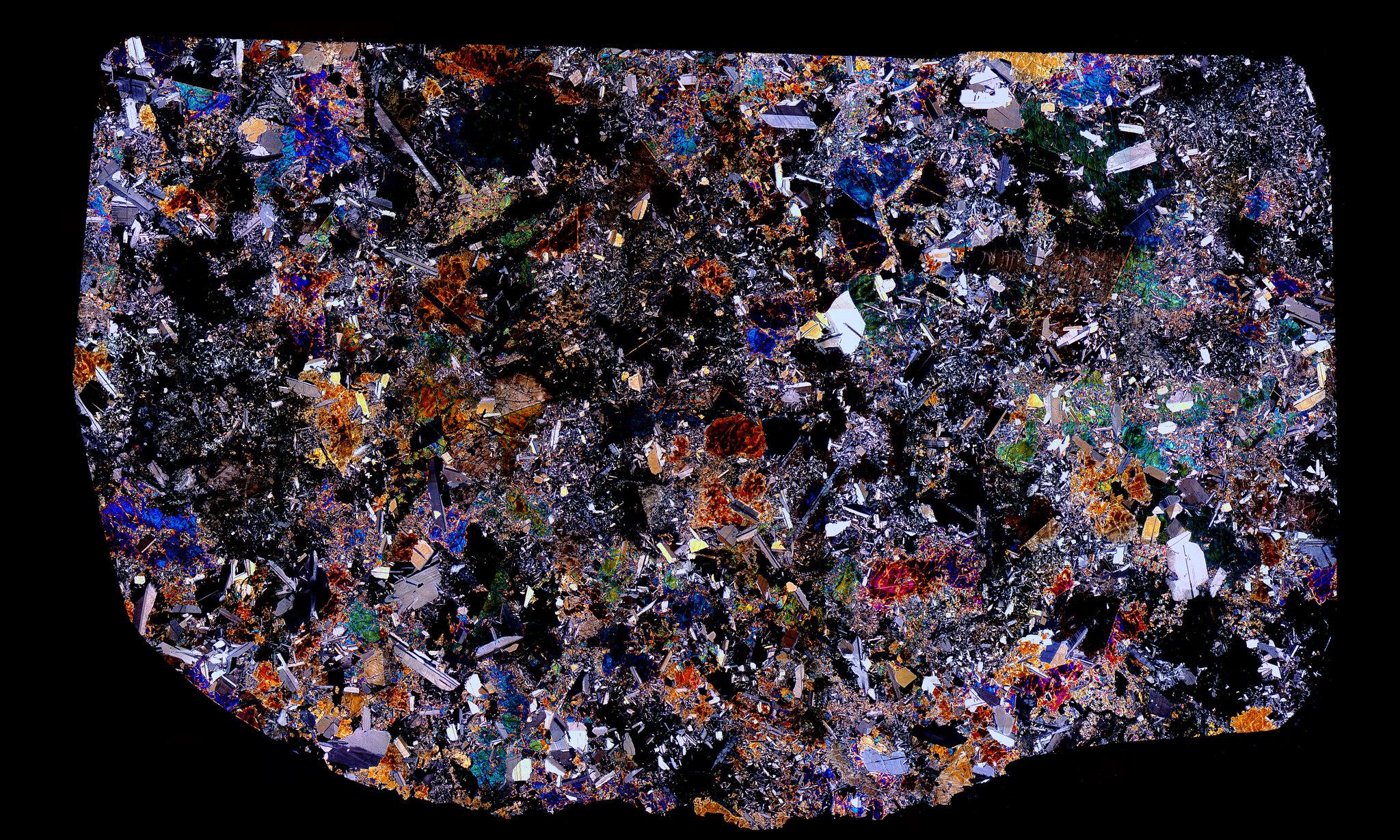 Northwest Africa (NWA) 5000 Meteorite Thin Section in Cross Polarized Light.