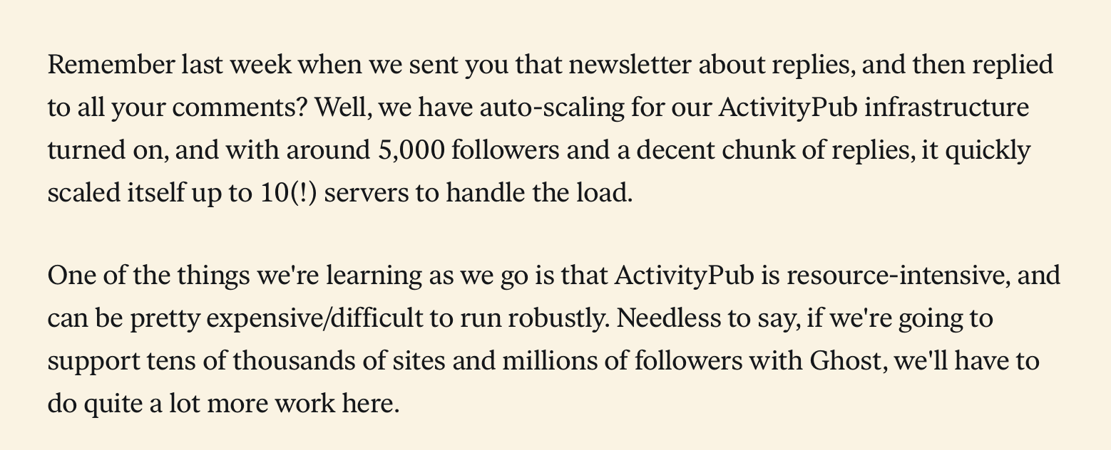 I'm sorry, it took *how* many servers to post a single long message from Ghost to 5k fediverse accounts and handle some replies?