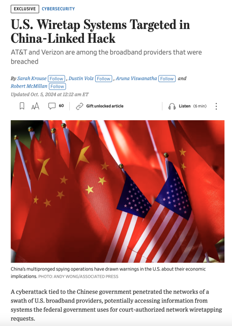 China targeted and might have held for months access to the infrastructure used to do wiretaps on the AT&T and Verizon networks.