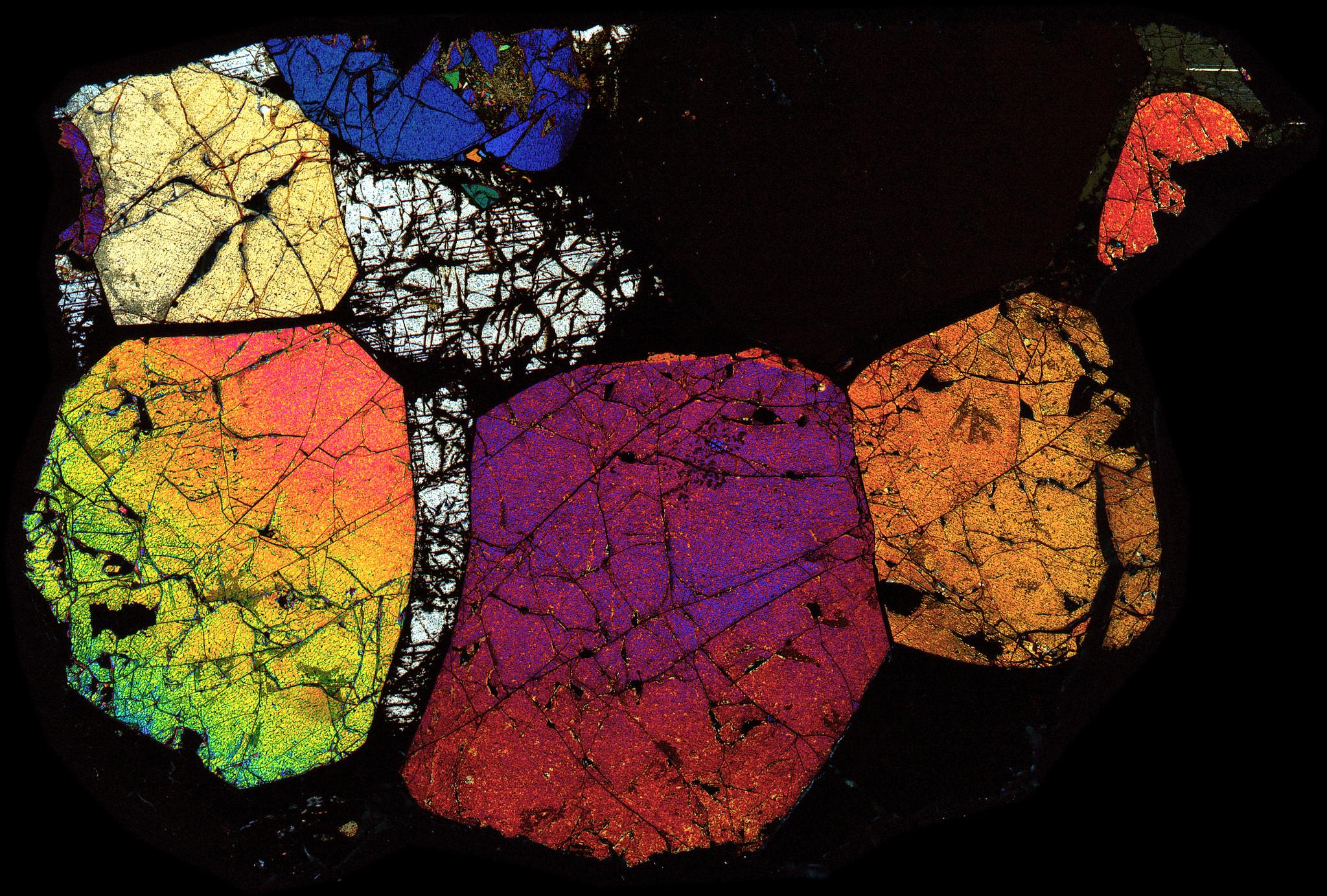 Northwest Africa (NWA) 5558 Meteorite Thin Section in Cross Polarized Light.