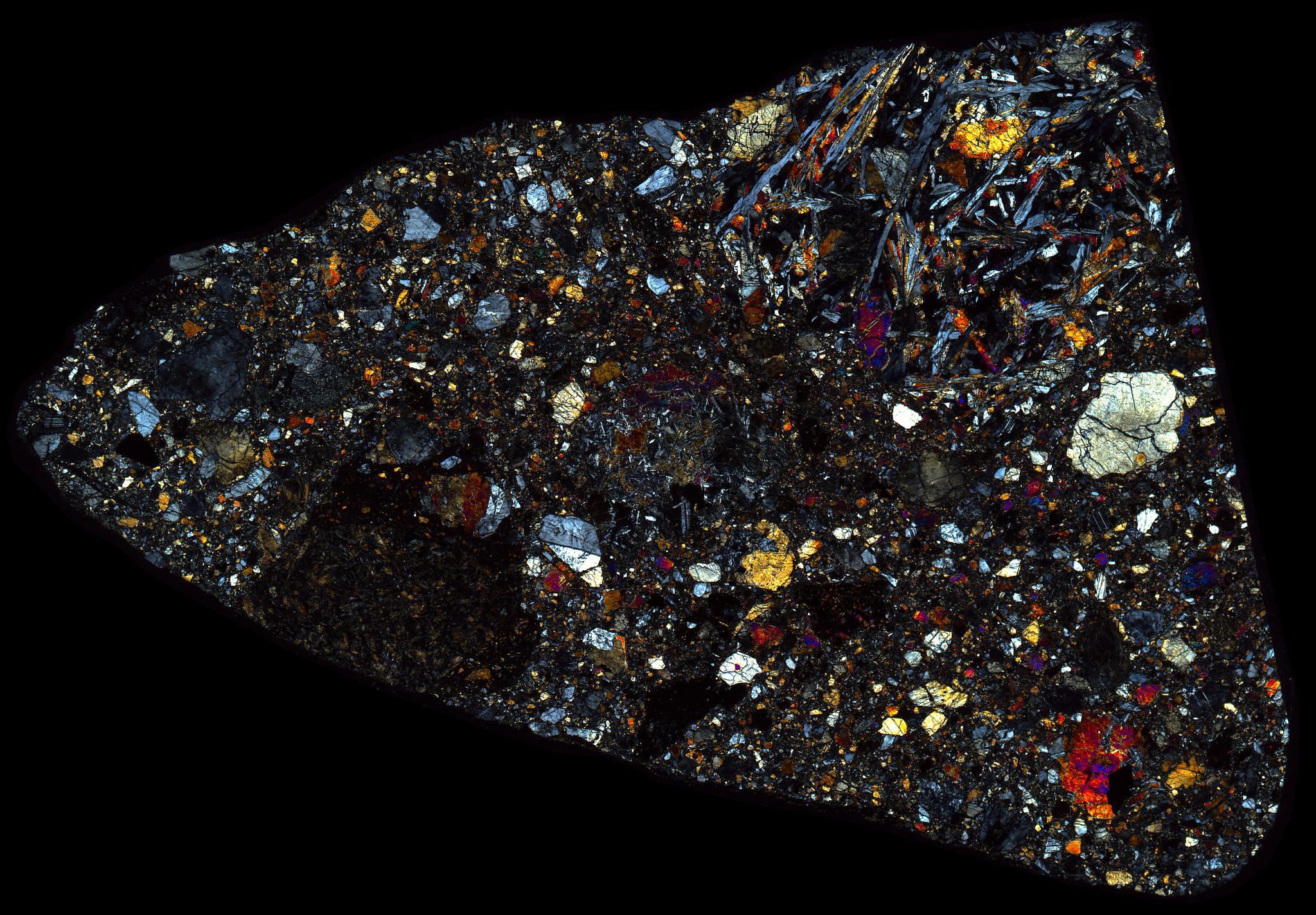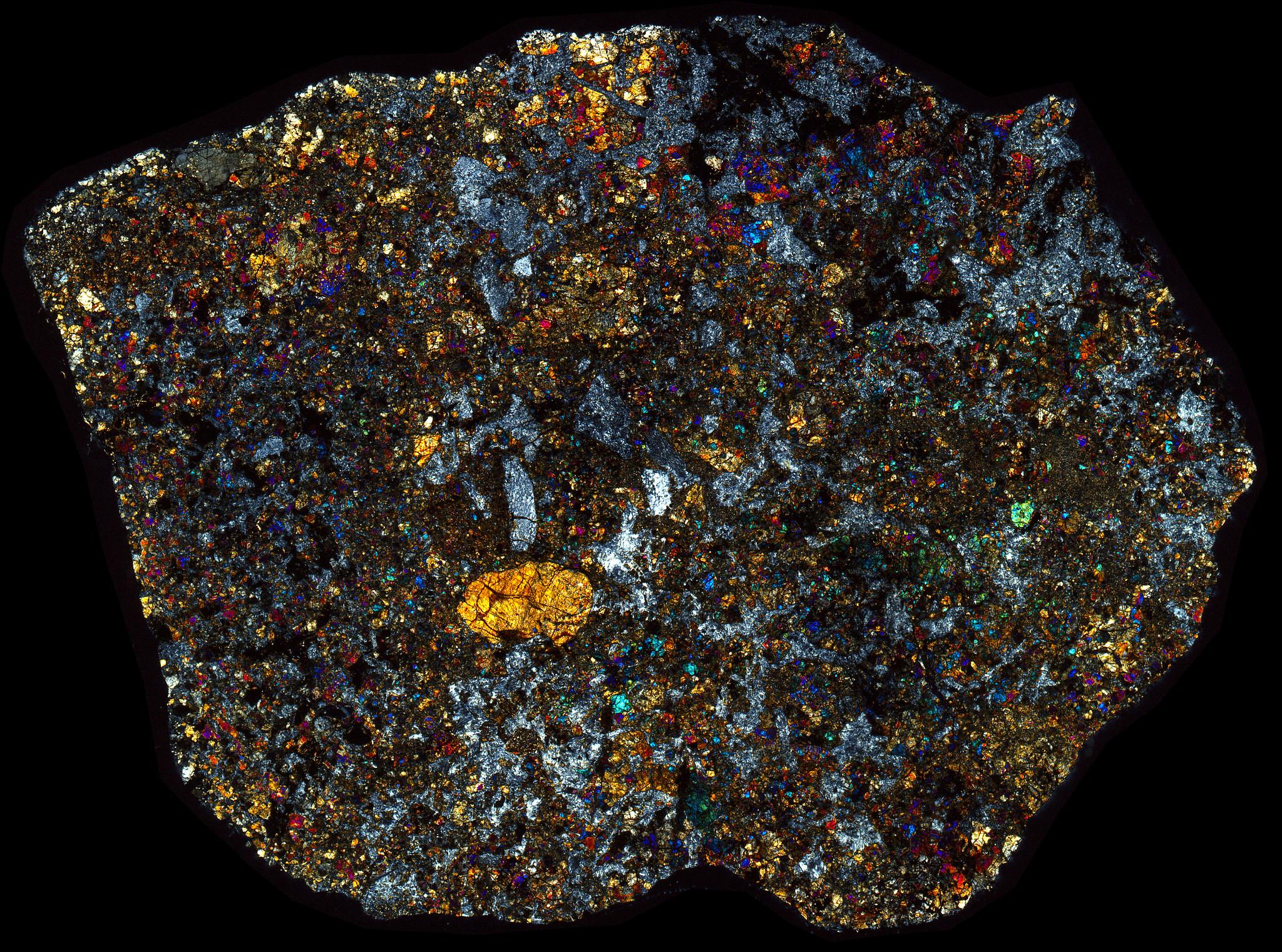 Northwest Africa (NWA) 2871 Meteorite Thin Section in Cross Polarized Light.