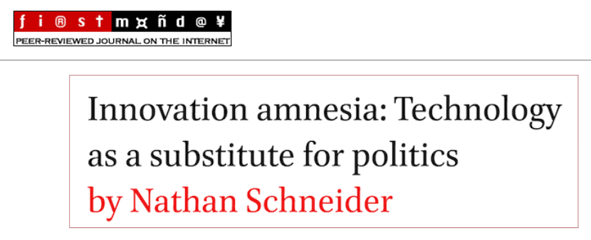 Publication title: "Innovation amnesia: Technology as a substitute for politics" by Nathan Schneider.