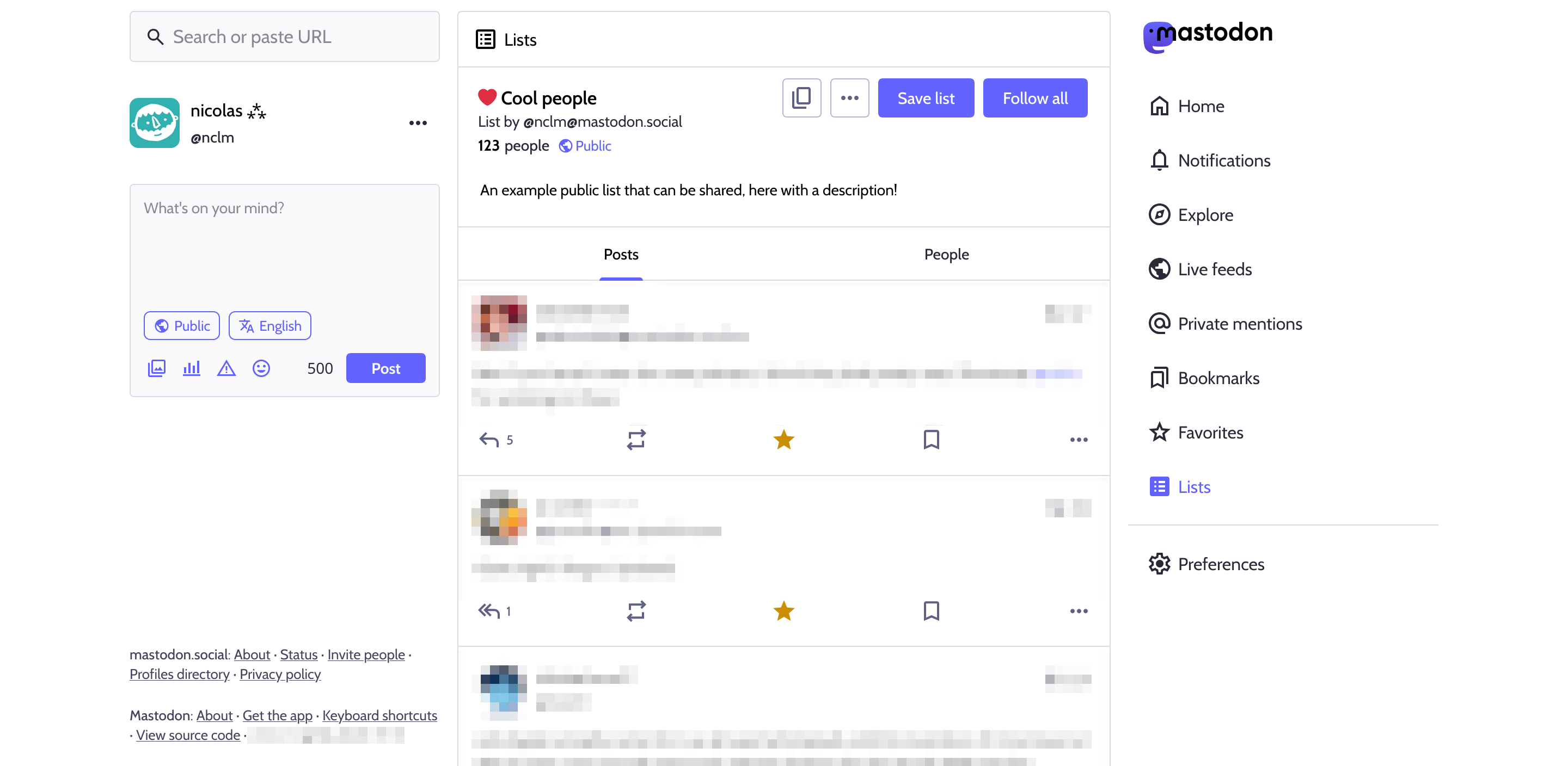 Made yesterday a couple very quick rough mockups of how lists on Mastodon could be extended to be public and/or used as starter packs. I think it could be one of the easiest way to share follow recommandations with a minimum of change from the bits Mastodon already has? (another could be being able to generate a CSV of a specific set of people and then share that to be imported, but that’s much more technical)