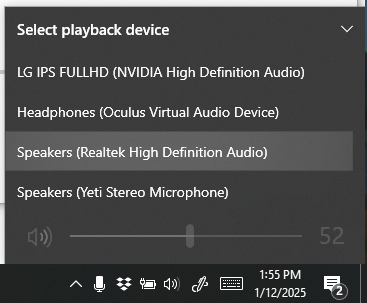 On my Windows 10 machine, I can switch the audio output device by clicking on the speaker icon in the bottom right. It brings up a list. This list contains eight (8) items, only two of which I frequently use, and some of which relate to software programs I no longer use at all.The list can only show four at a time. The two I use ("LEN" and "LG") are at opposite ends of the list, so I have to scroll every time.