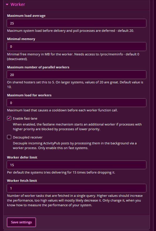 I have huge problems with the worker queue, it periodically gets stuck for a very long time, processing nothing for hours or (more often) days (so far the maximum was 11 days) when it just grows a processes nothing. This means that my friends can't send each other private messages, public posts don't federate and any sort of permission-restricted posts get stuck on "pending" for days.