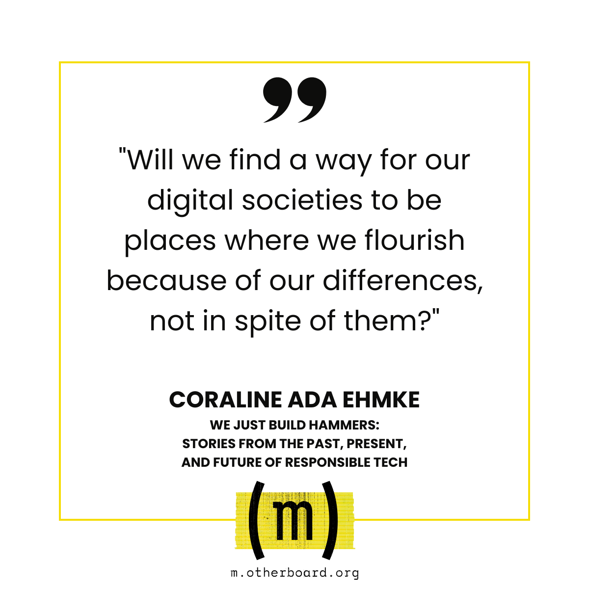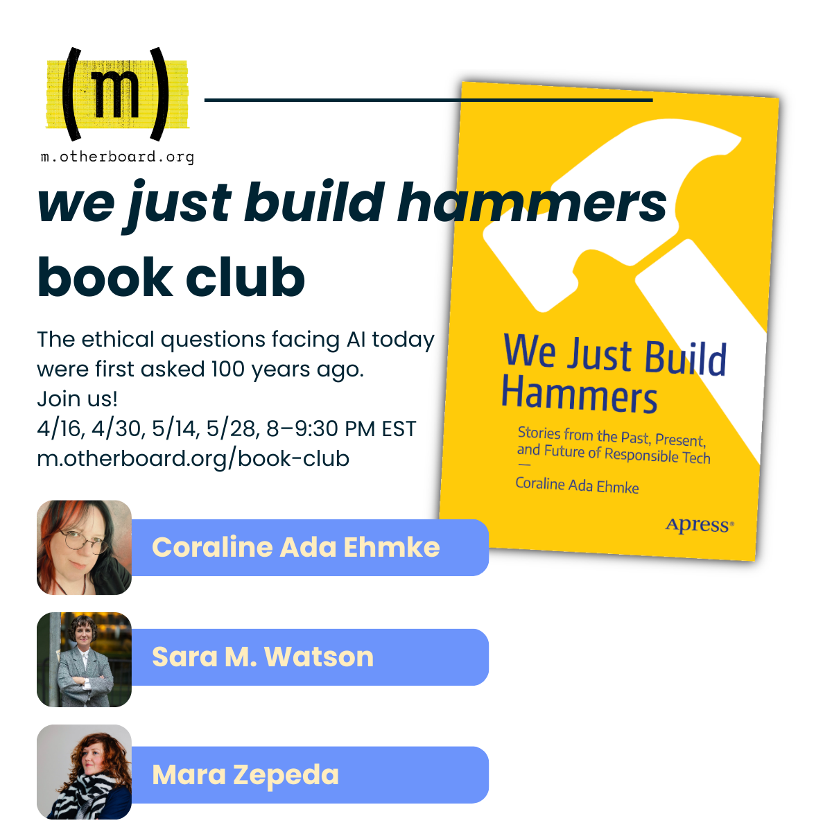 Kicking off today: join (m)otherboard's book club for open source legend @CoralineAda's new book, “We Just Build Hammers: Stories from the Past, Present and Future of Responsible Tech”!