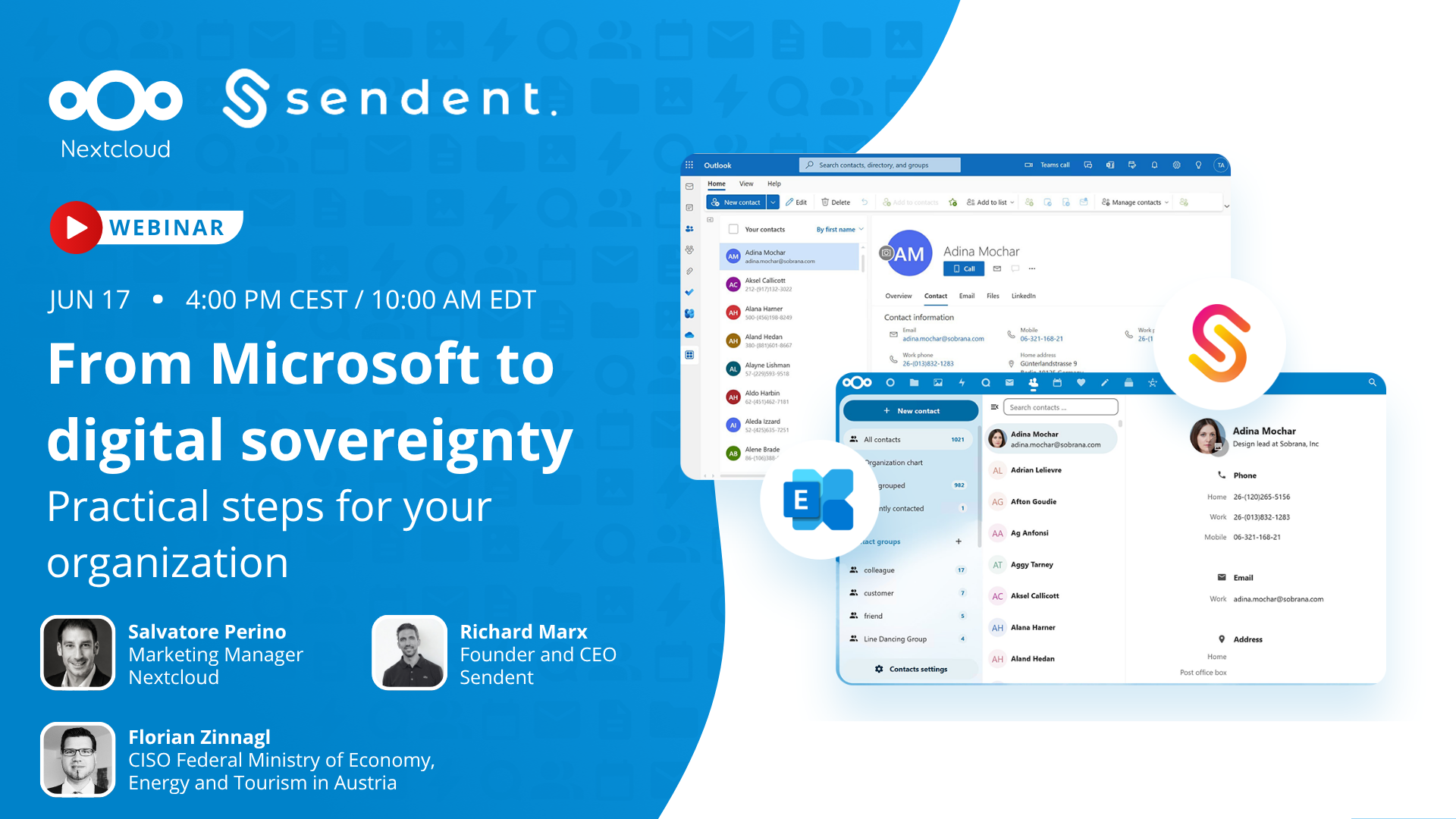 Join Nextcloud, Sendent, and a special guest from the Austrian Federal Ministry of Economy, Energy, and Tourism to learn how to gain greater control over your data and IT infrastructure—even if you currently rely heavily on Microsoft.Nextcloud
