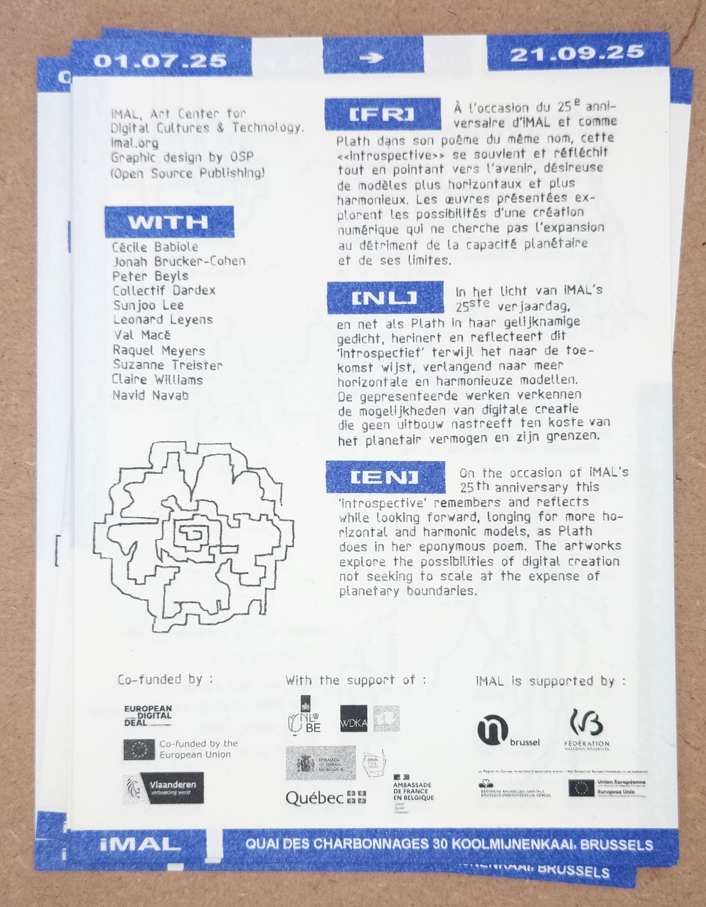Together with @vinciane (as OSP) we worked on the visual identity of @imal next exhibition (imal.org/en/events/i-am-vertic…), currated by @320x200 and @l03s, a introspective of iMAL that focuses on digital art that escapes or preceed the alienating monoculture of homogenity/smoothness/ressource-intensiveness of modern technology.