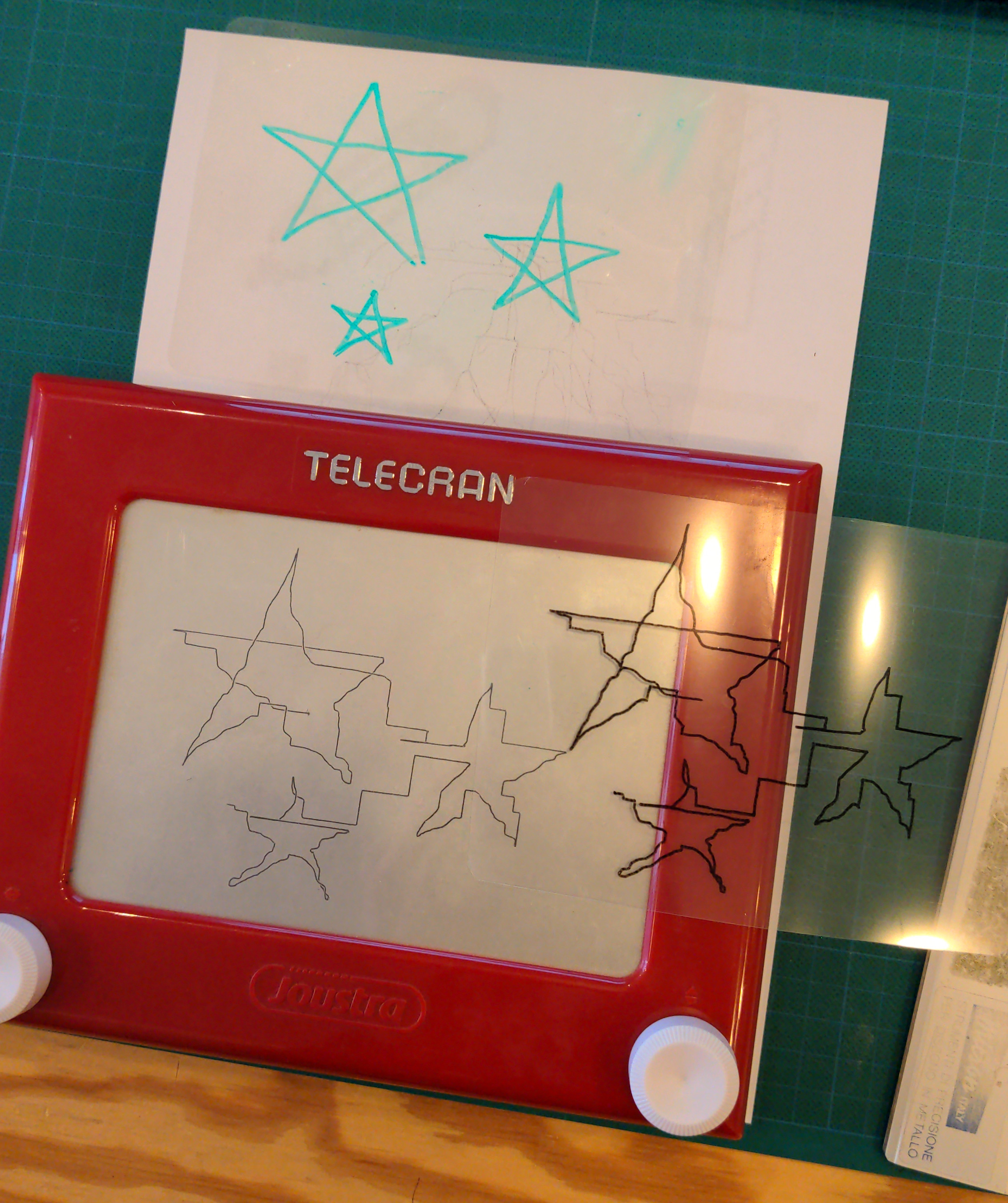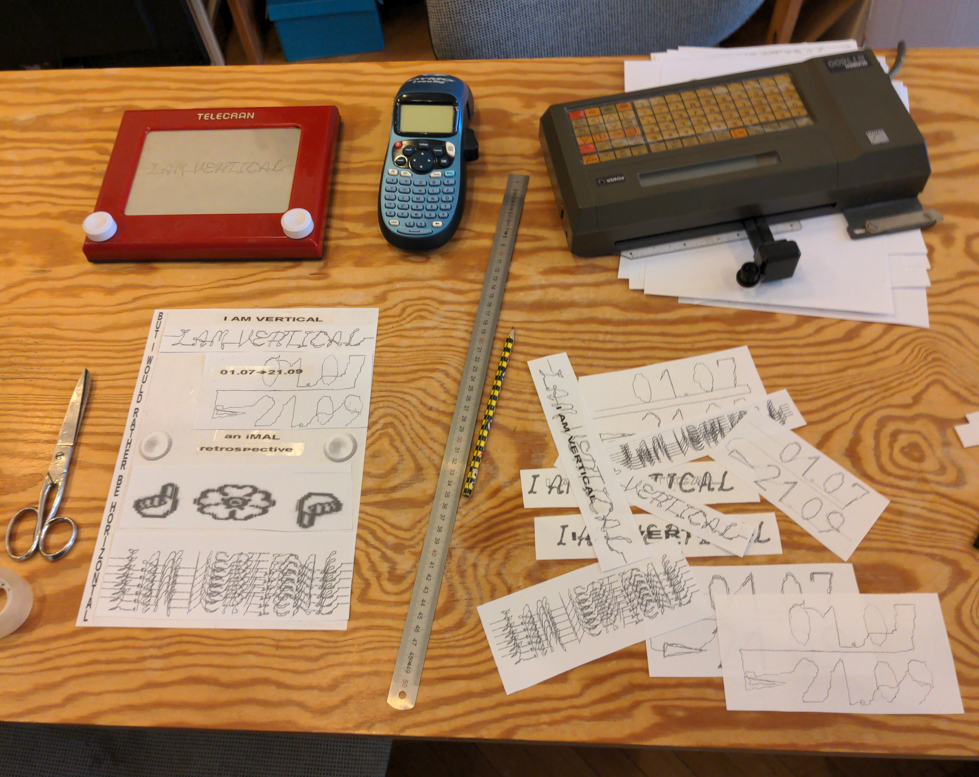 As an answer, we decided to work on the identity away from our modern devices (laptops and phones). Instead of relying on alternative/FLOSS softwares running on our modern devices, we searched for alternatives tools entierly. We ended up befriending: a telecran (or etch-a-sketch), a Dymo label printer, an old typewritter like pen-plotter, a copier, posca, conversations and our hands.